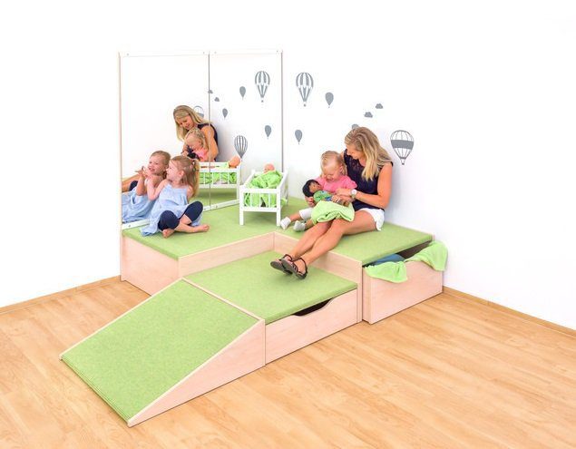 Met de grote spiegel hebben vooral kleine kinderen plezier in het kijken naar hun omgeving. Ze reflecteren speelgoed en kijken met belangstelling naar hun eigen spiegelbeeld. De podia met hoogwaardig, origineel TRETFORD-tapijt nodigen u uit om uit te rusten. De bekleding is stofbindend, klimaat regulerend en gemaakt van 100% natuurlijk haar (80% geitenhaar, 20% zuivere scheerwol). Bovendien is het bijzonder duurzaam en daarom uitermate geschikt voor gebruik in crèches. Antistatische en zware ontvlambaarheid zijn extra voordelen van het tapijt.