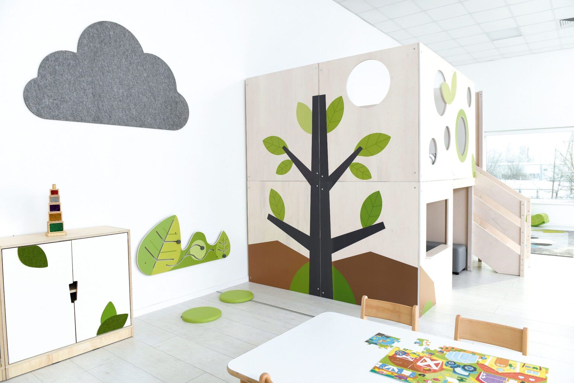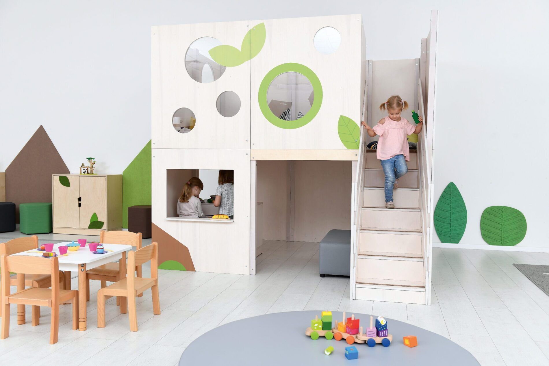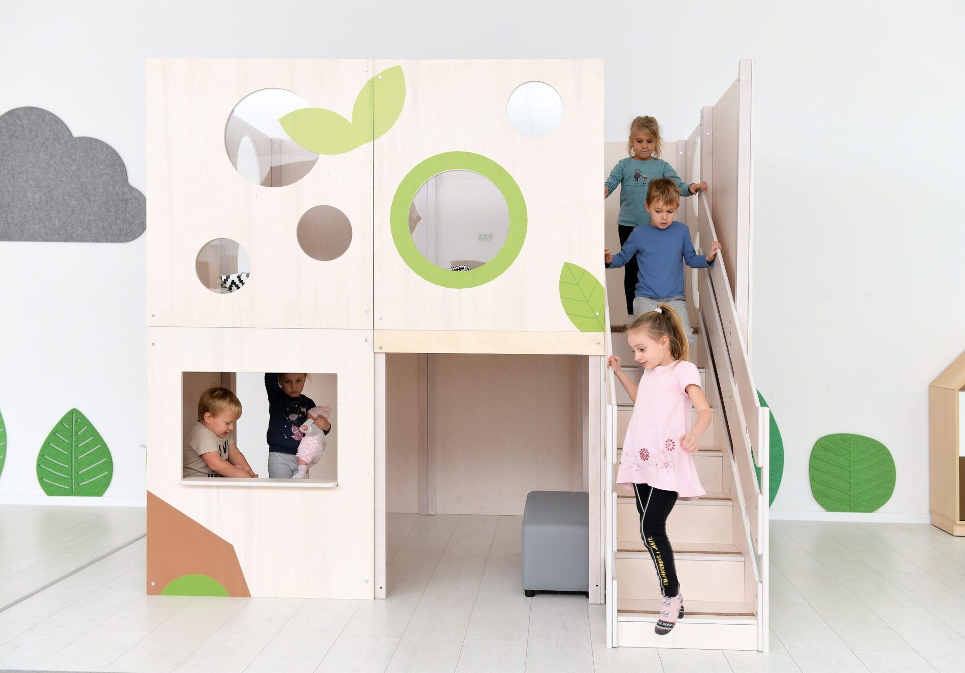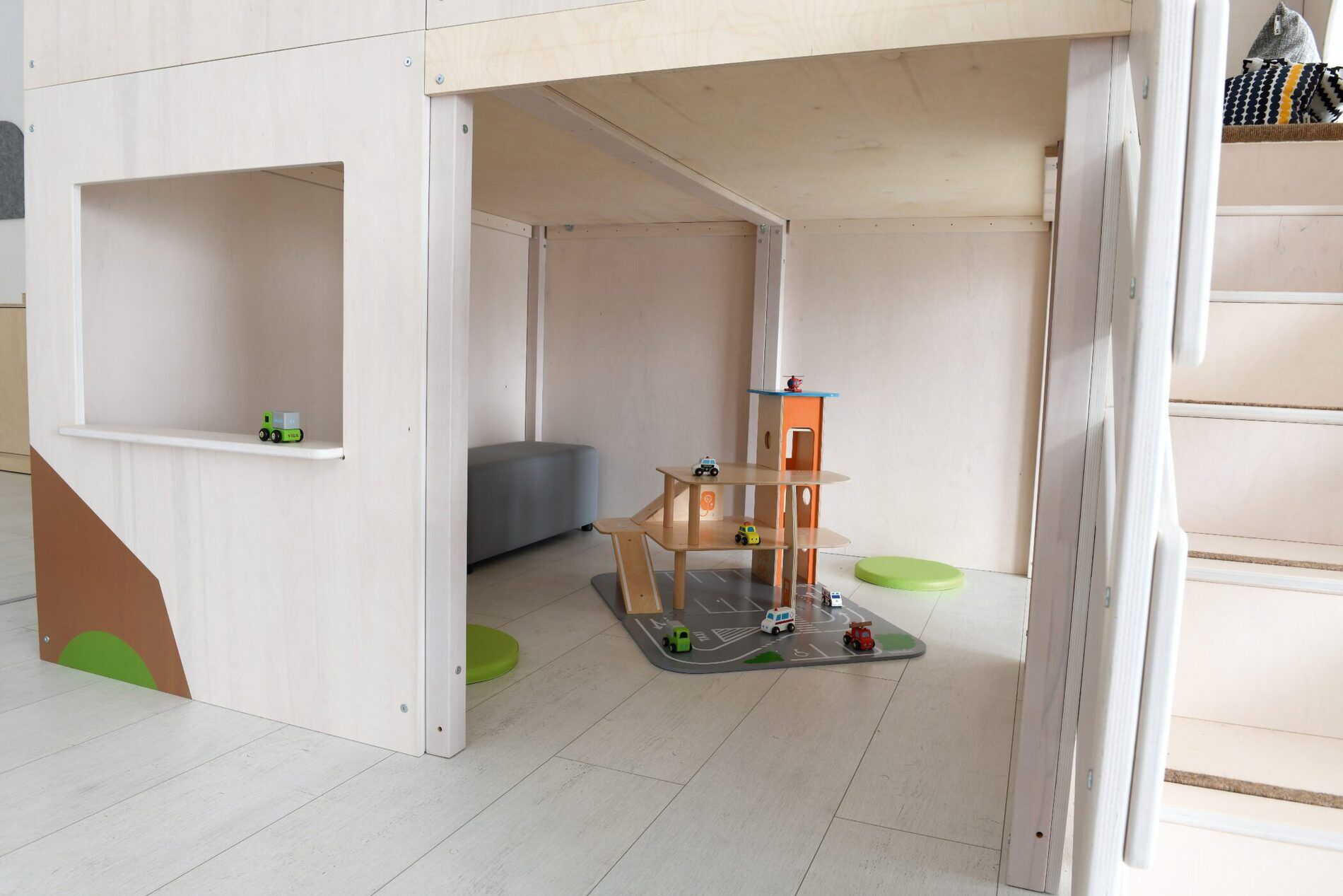 De wanden van de bovenverdieping bevatten patrijspoorten (met veilig plexiglas), waardoor kinderen mooi kunnen (uit)kijken