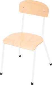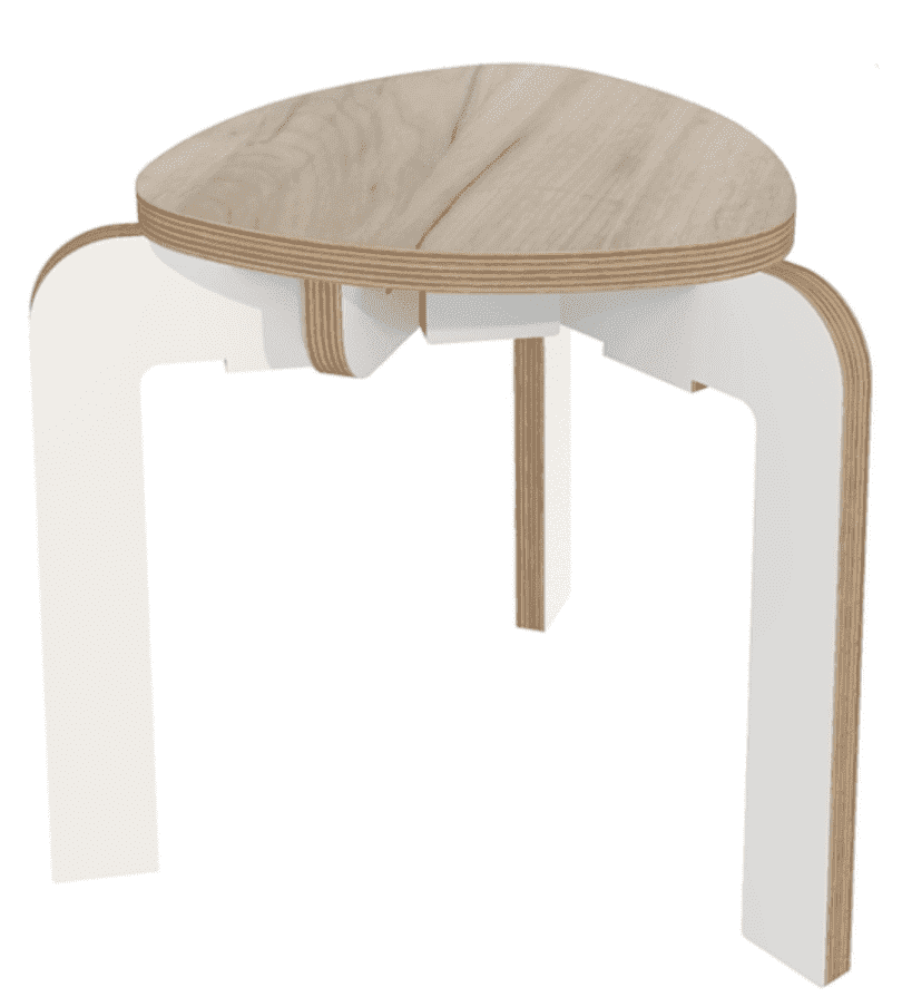 Solide driepoot kruk met een grijs eiken decor zitting en wit onderstel, die te stapelen is zodat de krukken gemakkelijk op te bergen zijn. Voorzien van een driehoekige zitting met afgeronde hoeken.