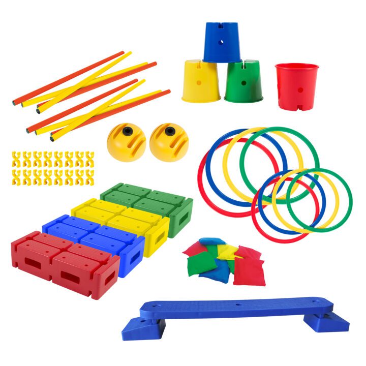 De verschillende elementen van deze set maken het mogelijk een hindernisbaan op te zetten en te werken aan verschillende motorische vaardigheden: balanceren, springen, oversteken, richten, gooien...