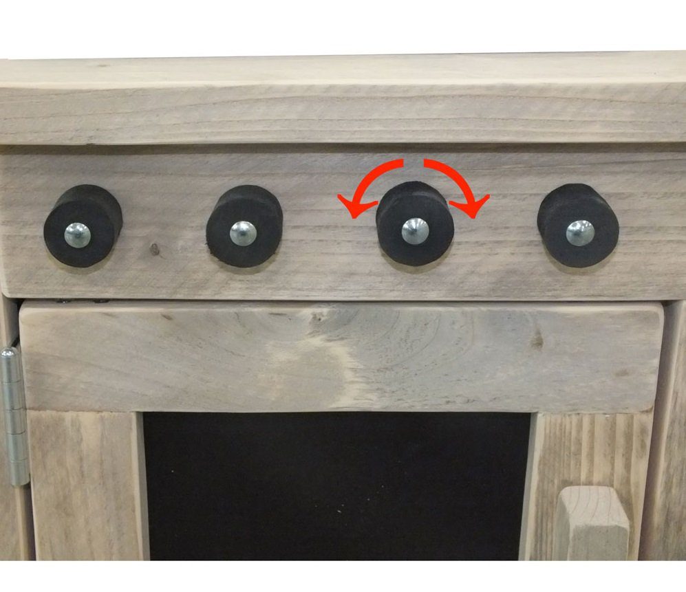 De 4 greepjes voor de inductie kookplaat zijn allemaal echt te draaien, zo kunnen alle kinderen “echt” meekoken.