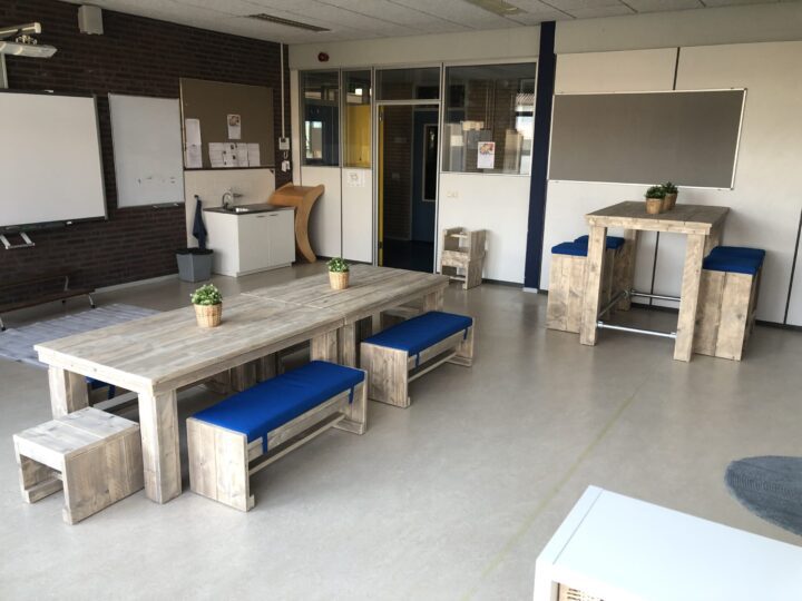 De steiger tafels, banken en krukken zijn leverbaar in naturel steigerhout of whitewash. (afbeelding is whitewash)