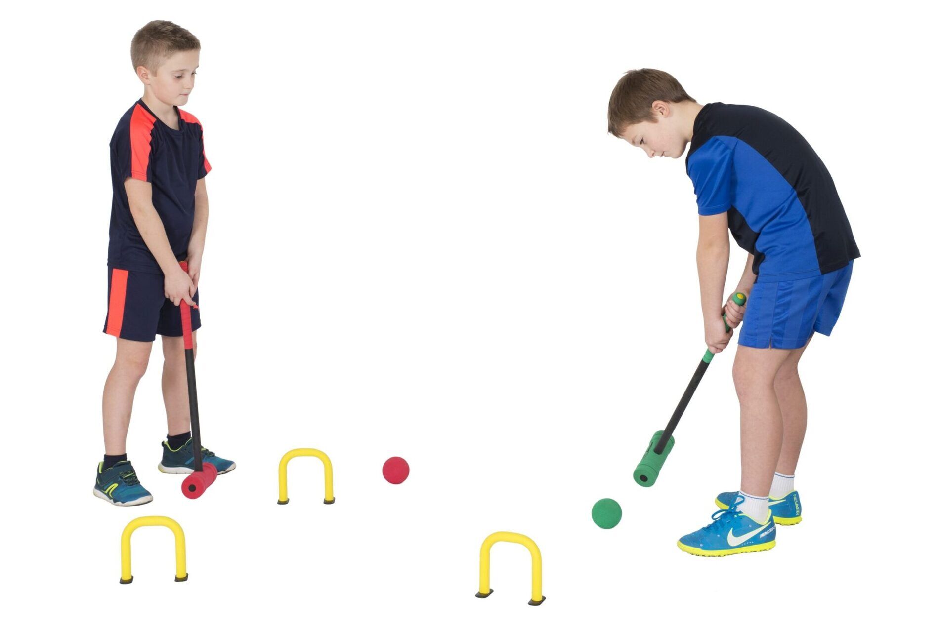 Deze Super Foam Croquet Set voor binnen is erg leuk en veilig om mee te spelen. Levendige kleuren, schuim en zacht rubber wordt veel gebruikt en maakt het duurzaam genoeg voor alle leeftijden. Elke hamer heeft ook een super van 22 cm schuimrubberen grip voor positieve controle. De set bestaat uit zes paar bijpassende gekleurde hamers en ballen. Set bevat: · 6 schuimstokken (63 cm lang. Kop: 6,3 cm diameter, 18 cm lang) · 6 ballen die niet stuiteren (8 cm) · 9 poorten (15,2x15x2cm) · 2 vrijstaande vlaggen (hoogte: 22,9 cm).