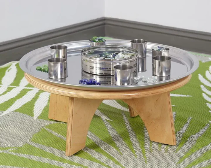 Een fantastisch klein zintuiglijk tafeltje. Met onze lage ronde tafel en ons zilveren dienblad heb je een geweldige kleine combinatie. Je kunt ze natuurlijk ook allebei apart gebruiken.