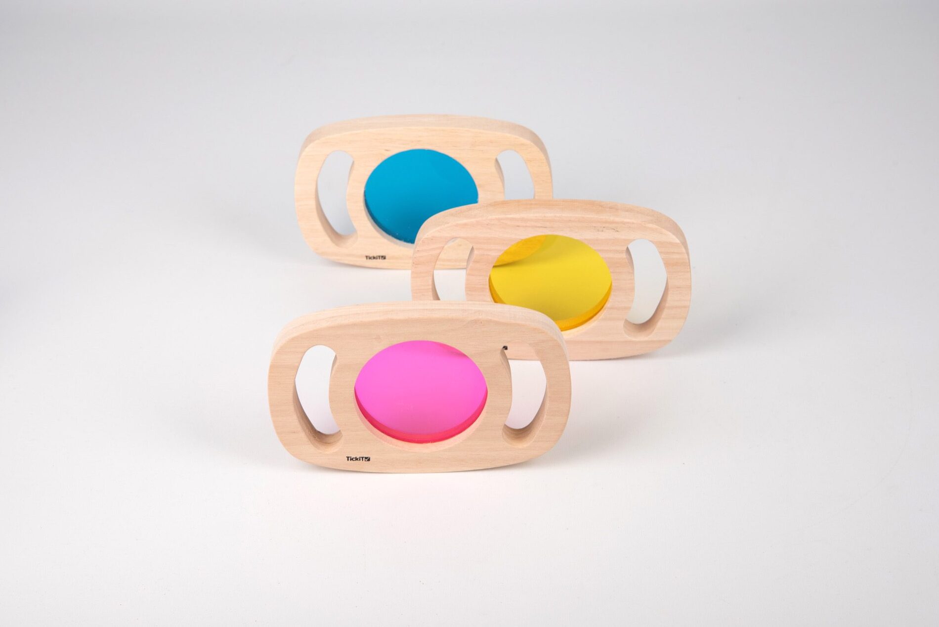 Deze set bestaat uit 3 transparante gekleurde acrylplaten (lichtrood, blauw en geel) die zijn afgedicht in stevige rubberhouten frames met handige handgrepen. Kinderen kunnen door deze platen kijken en de wereld in verschillende kleuren zien, of ze kunnen meerdere platen gebruiken om nieuwe kleuren te creëren.