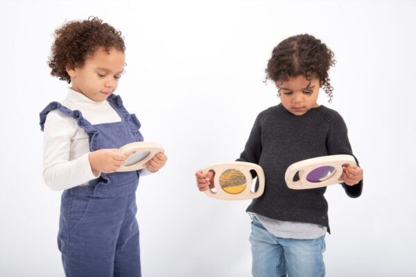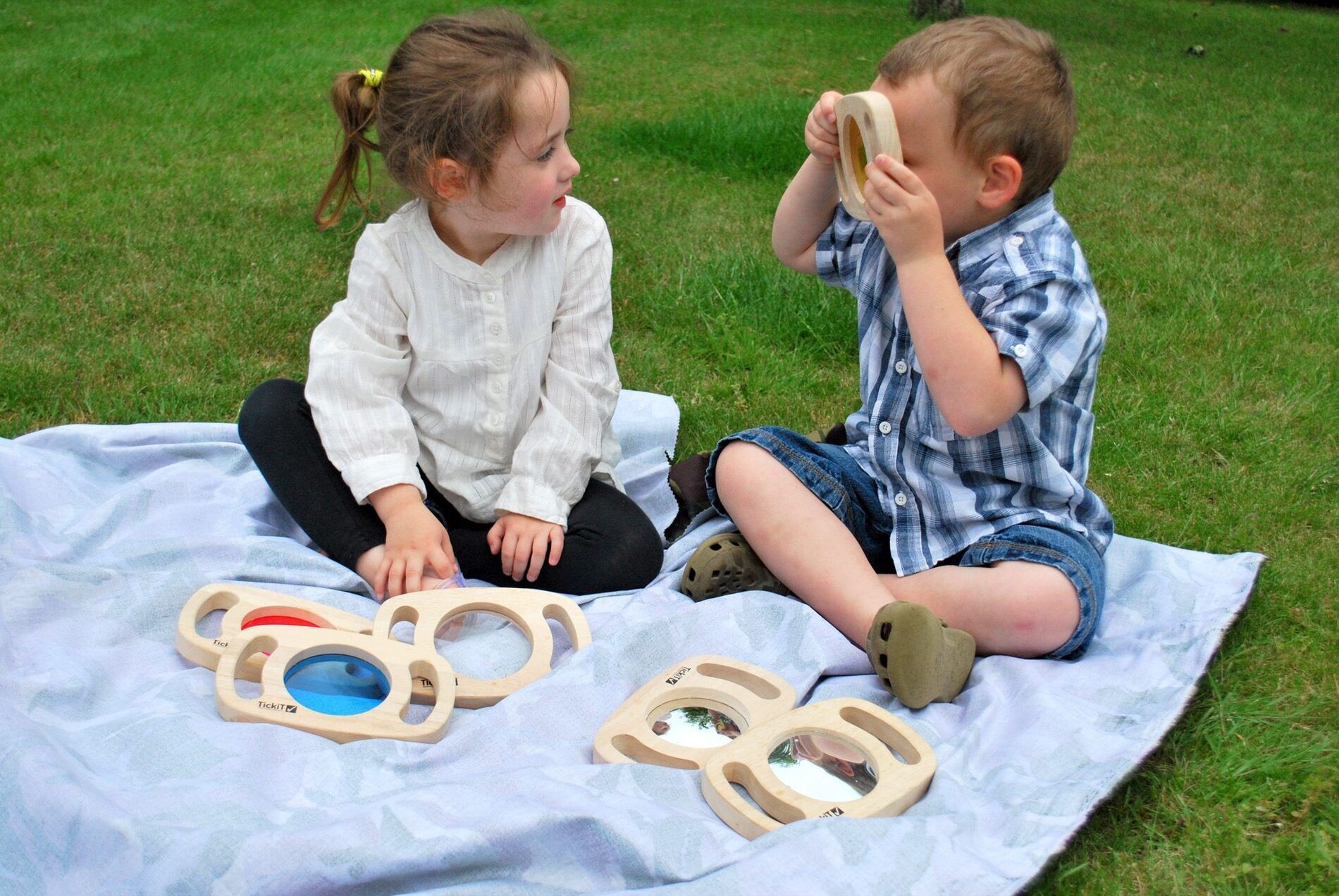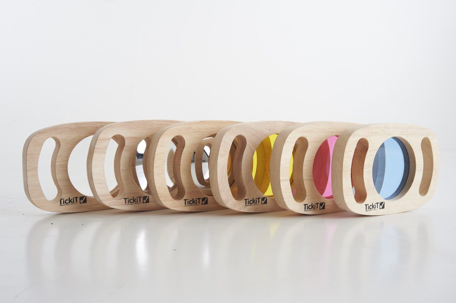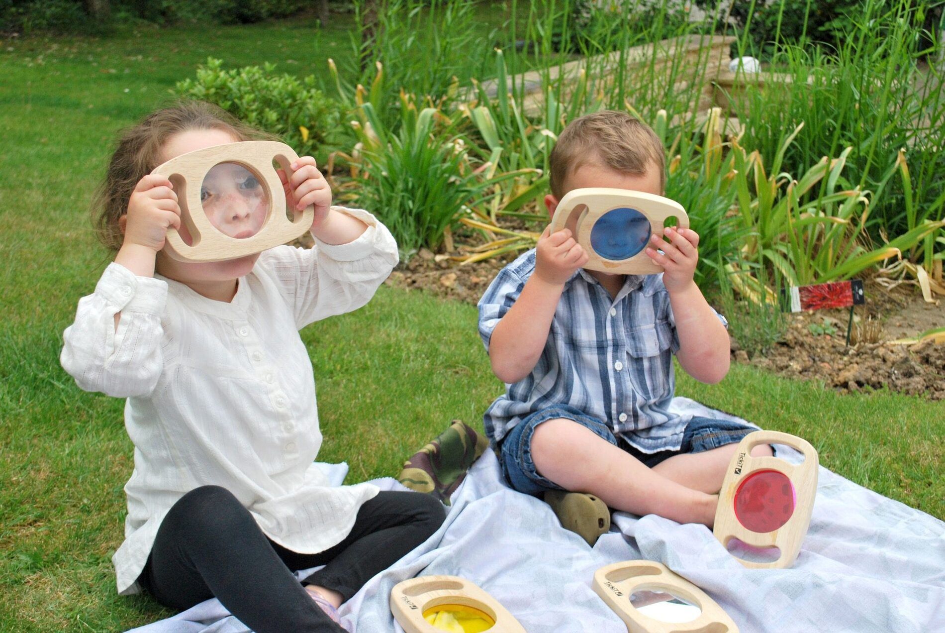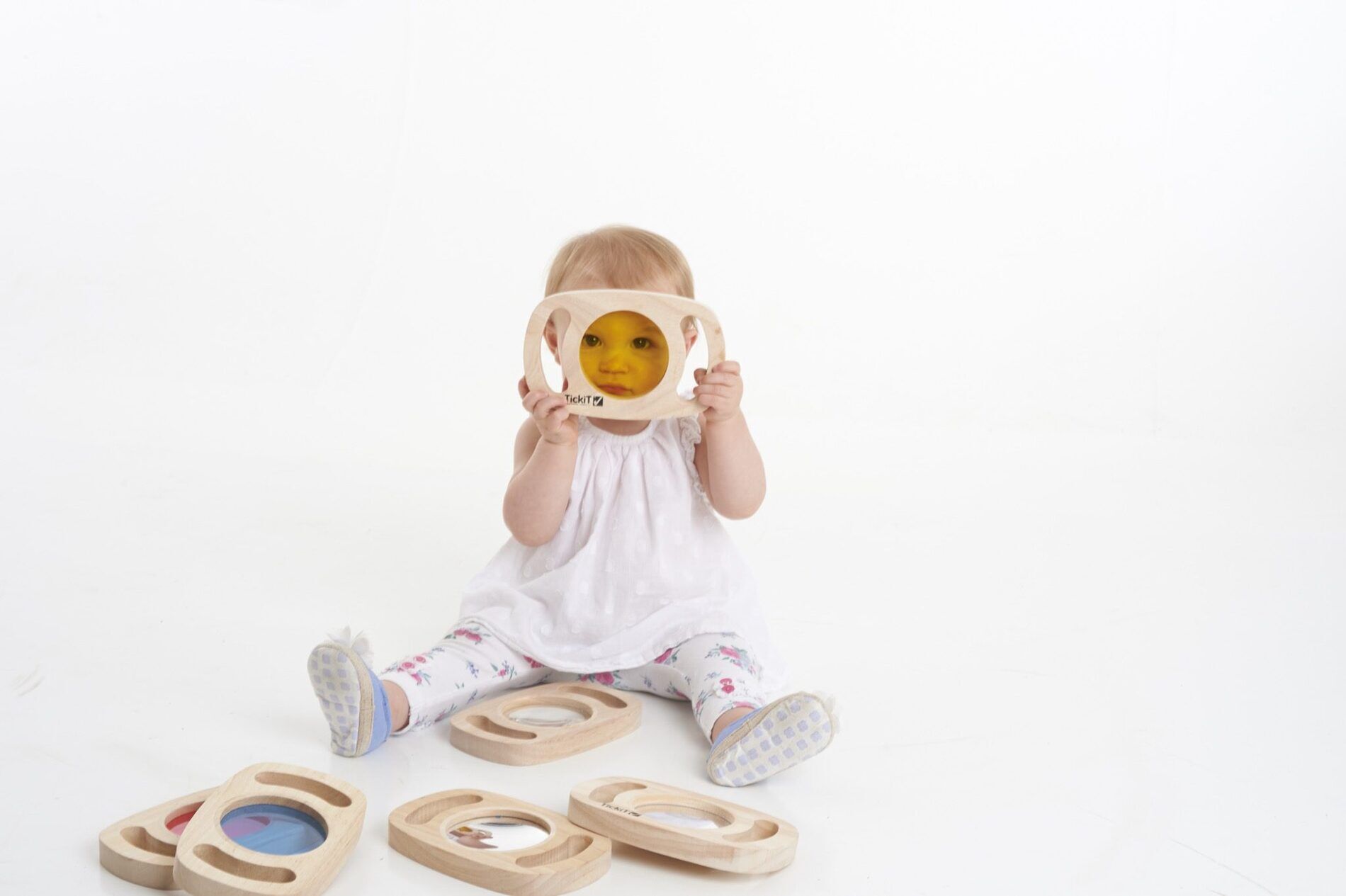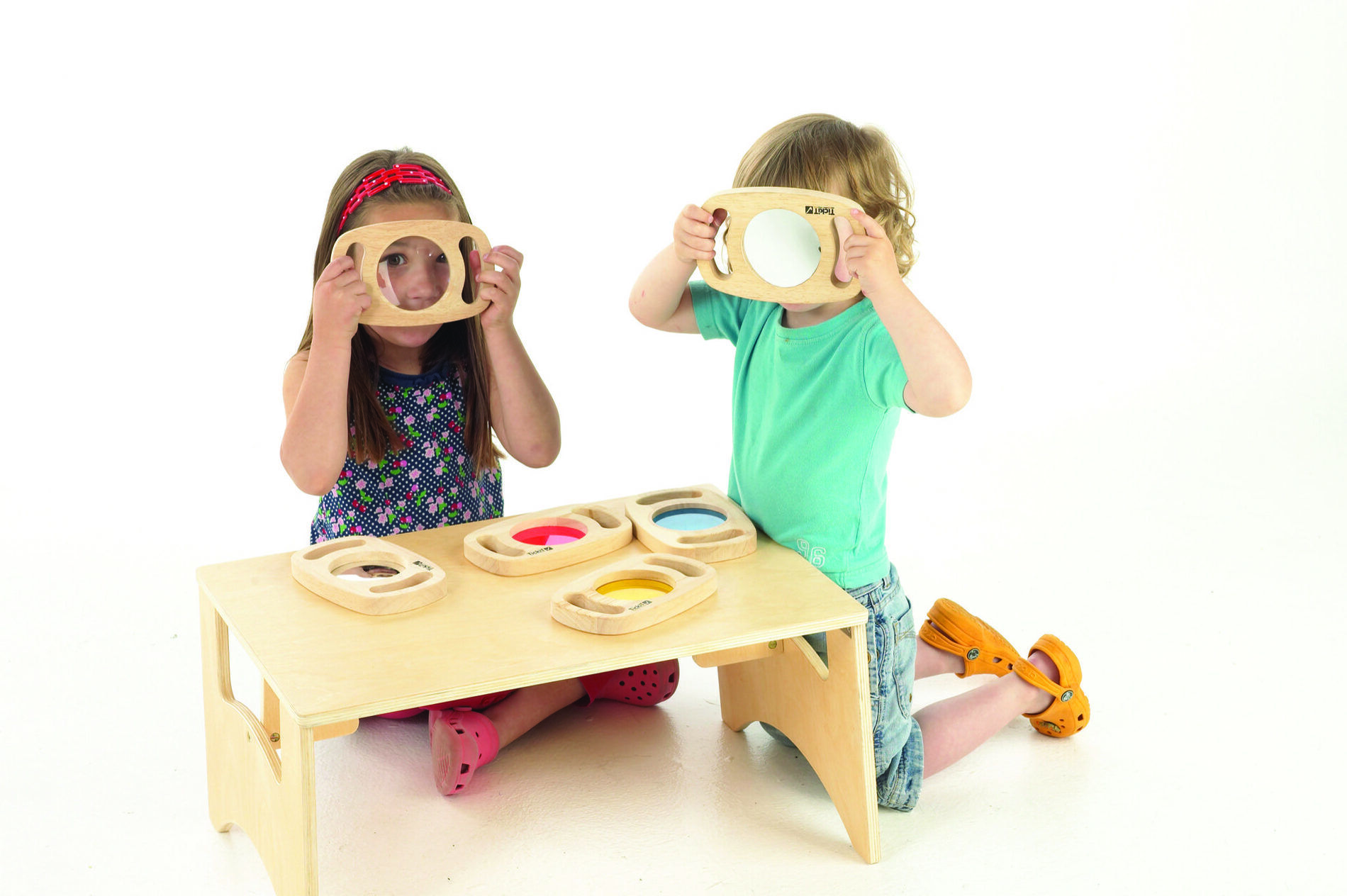 Met deze 6-delige set kunnen kinderen de wereld op een nieuwe manier ontdekken. De stevige rubberhouten frames bevatten lenzen waarmee ze de kleur van alles wat ze zien kunnen veranderen, een gigantische vergrootglas en spiegels die een ware en vervormde weerspiegeling van de wereld om hen heen geven. De set kan gestapeld worden voor kleurmenging en kan gebruikt worden op een lichtbak.
