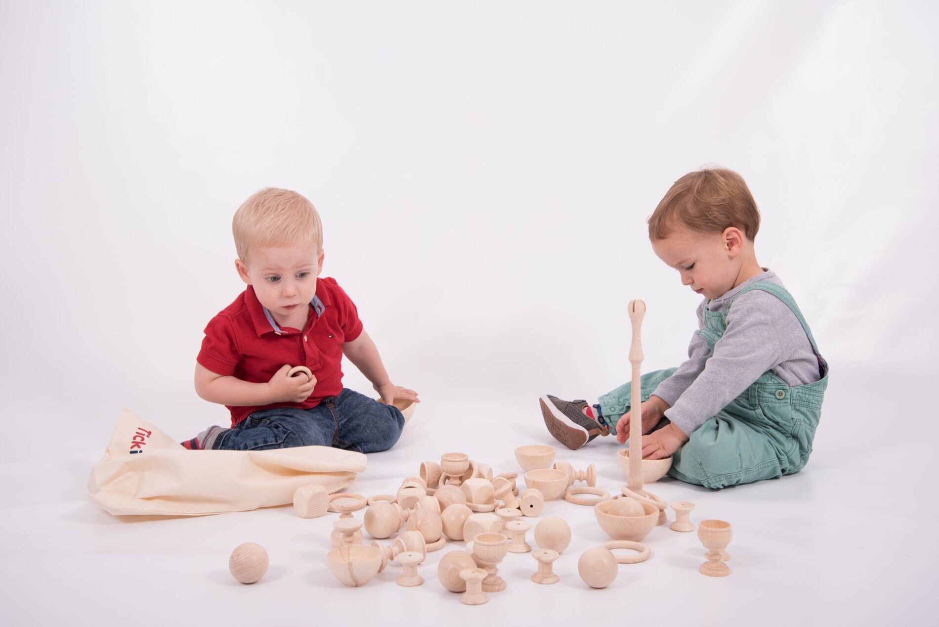 Deze grote set van 63 beukenhouten stukken bevat onder andere ringen, kubussen, eierdopjes, spoelen, ballen en kommen. Alles kan worden opgeborgen in een katoenen tas wanneer het niet in gebruik is.