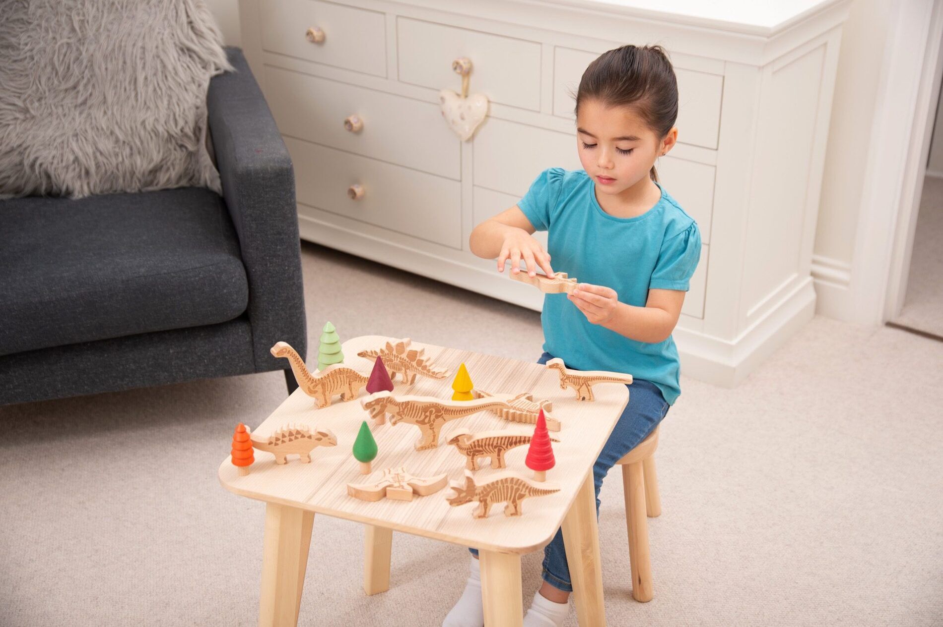 Stevige blokken gemaakt van beukenhout met voelbare lasergegraveerde details van de kenmerken van de dinosaurussen aan de ene kant en hun skelet aan de andere kant. De skeletkant kan worden gebruikt onder papier voor effectieve krijt wrijving, waarbij de botten en structuur op een leuke manier zichtbaar worden.