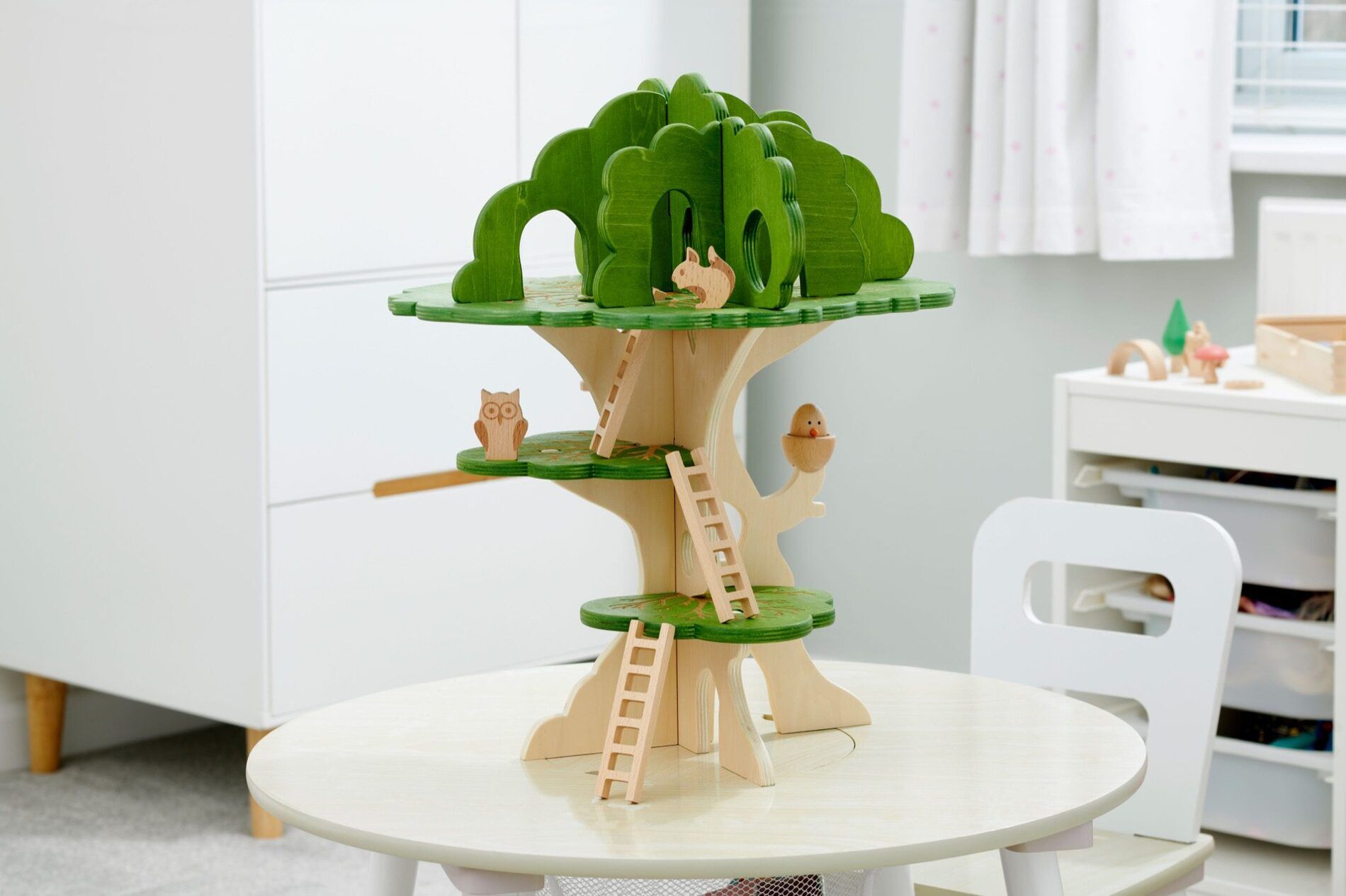 De boomhut is eenvoudig in elkaar te zetten en de bladerlagen zijn diep gegraveerd voor een interessant tactiel element. De ladders kunnen worden gebruikt om elke laag met elkaar te verbinden door middel van gaten en openingen.