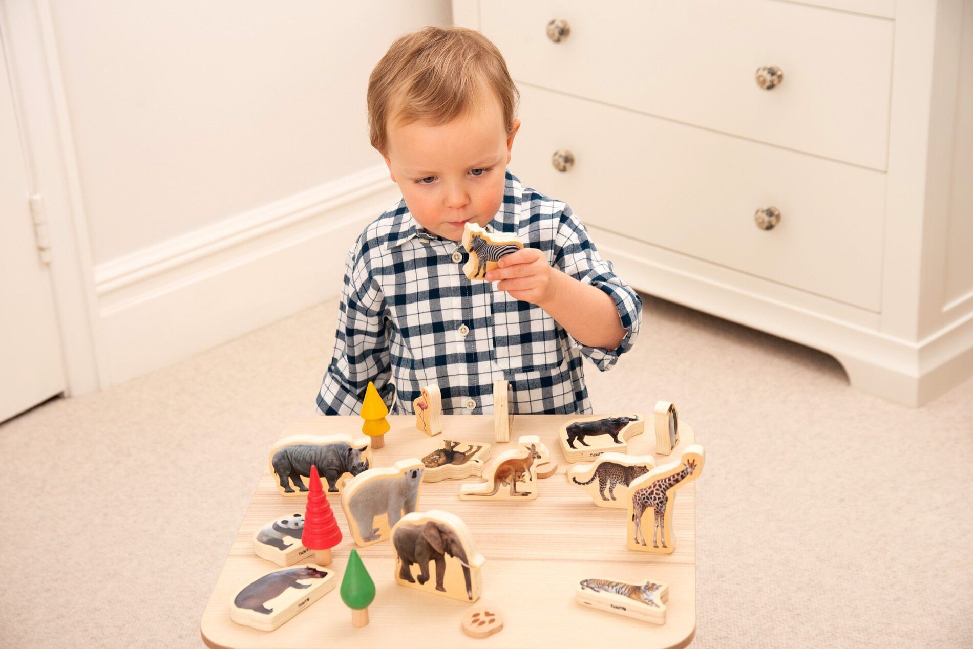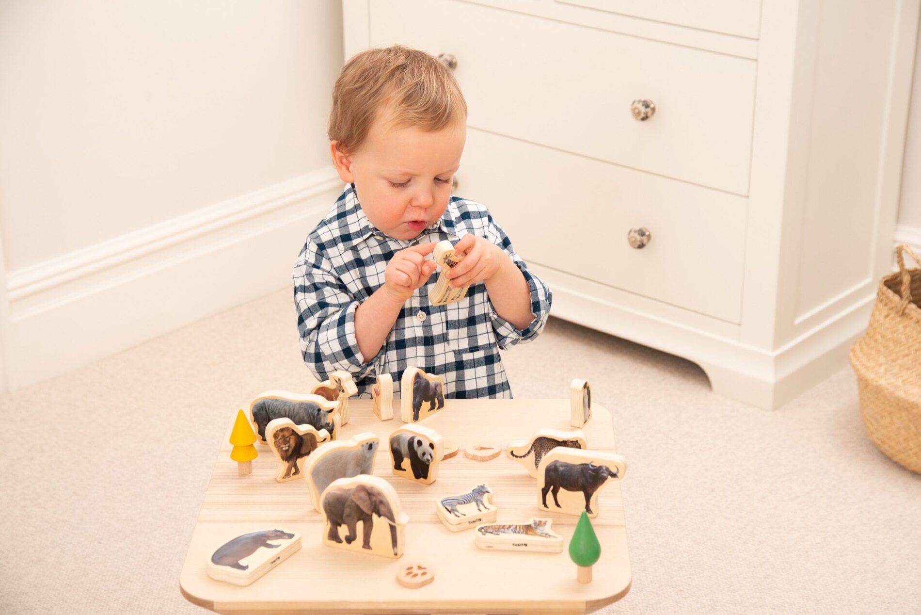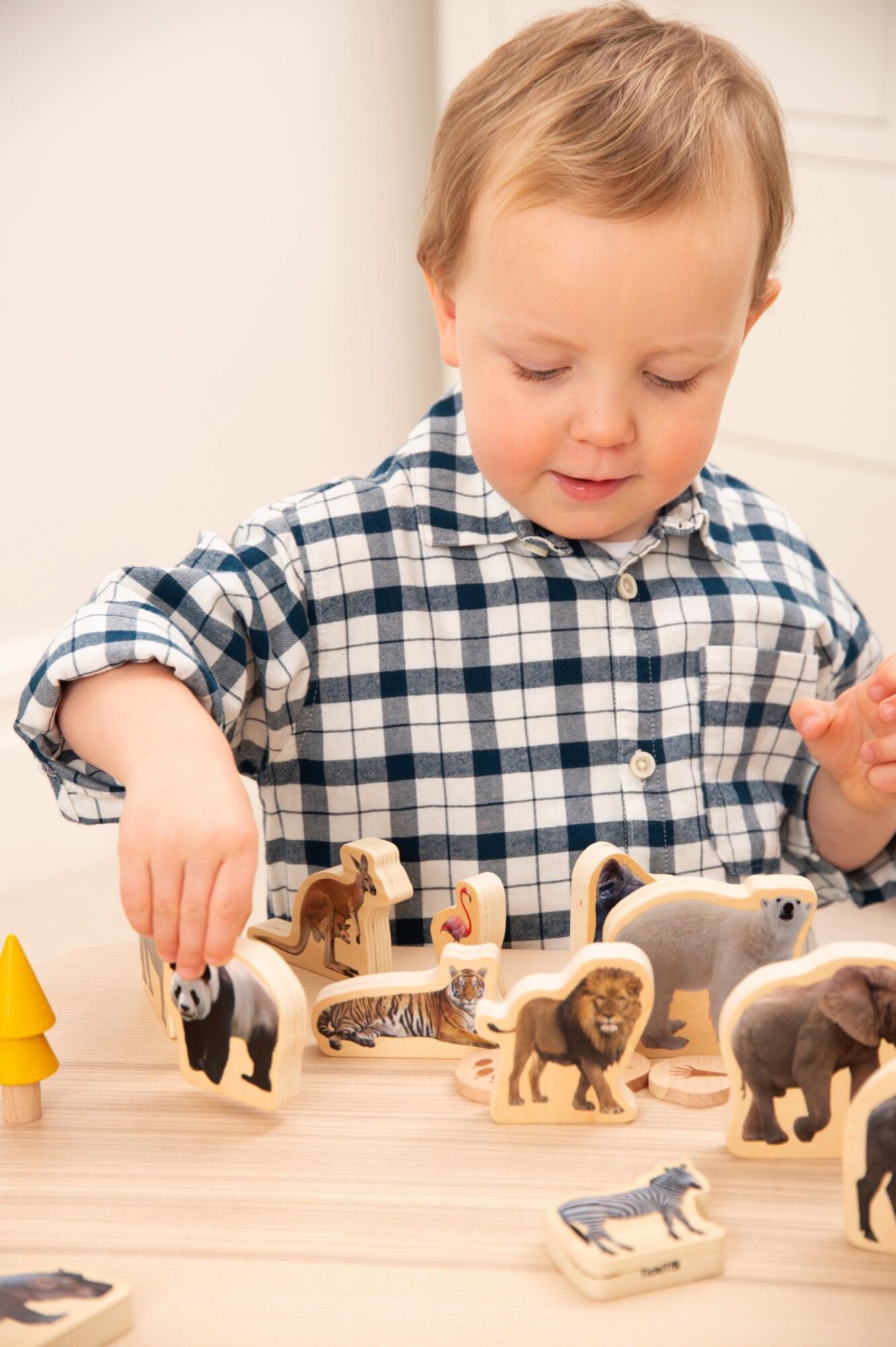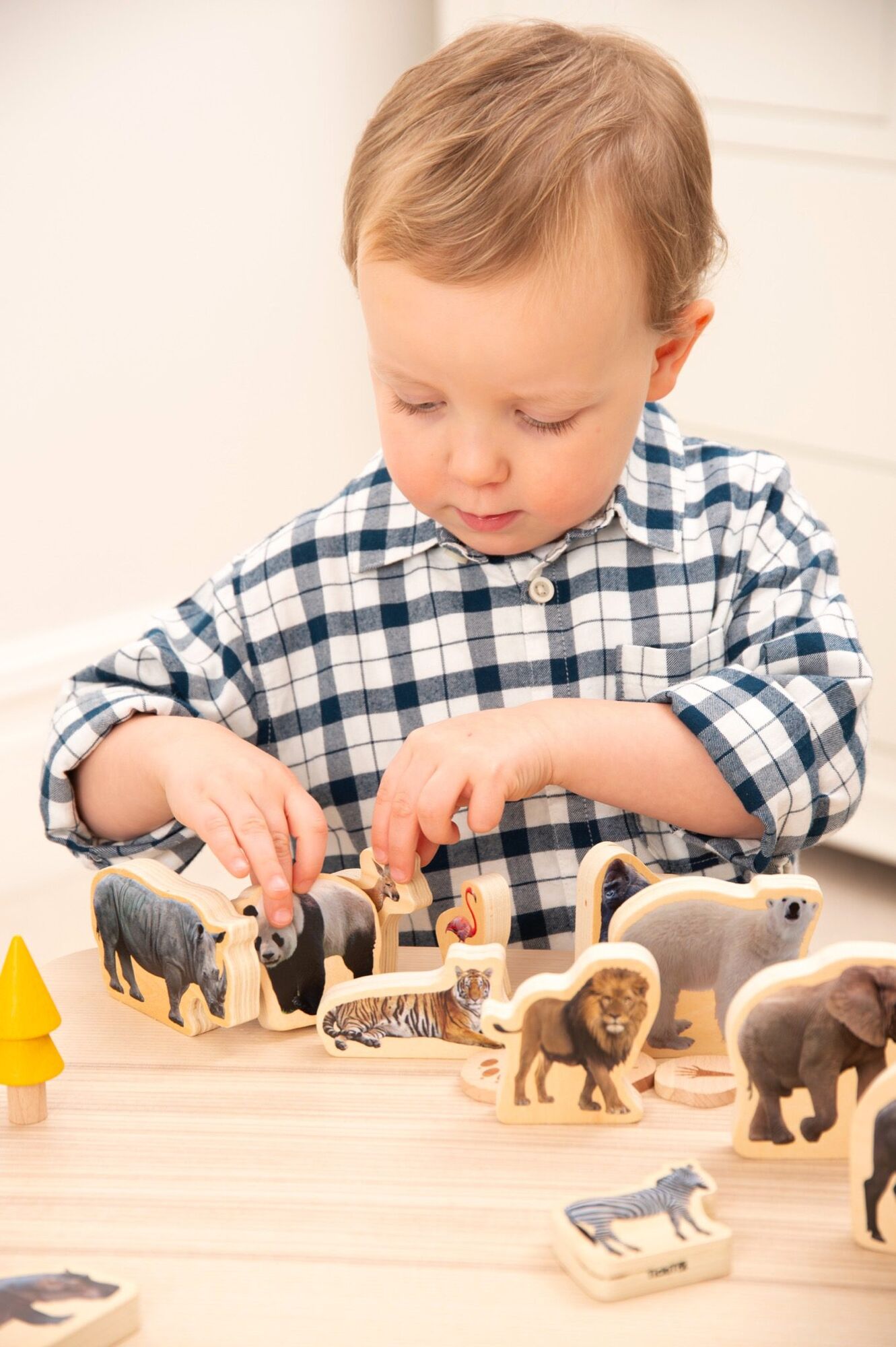 De robuuste houten blokken voelen glad aan en zijn gemakkelijk vast te houden, rechtop te zetten en op te stapelen voor kleine kinderen. De realistische afbeeldingen stellen jongere kinderen in staat om de namen en kenmerken van verschillende dieren van over de hele wereld te leren, en zullen oudere kinderen aanmoedigen om meer te weten te komen over deze fascinerende wezens, ze te visualiseren voor verhalenvertelling of creatief schrijven, en milieuonderwerpen te bespreken.