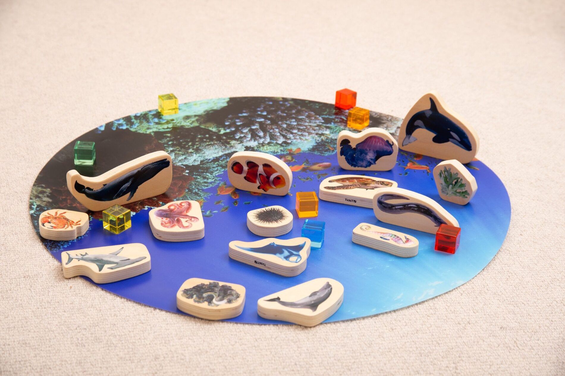 De robuuste houten blokken zijn glad om aan te raken en gemakkelijk vast te houden, rechtop te zetten en op elkaar te stapelen. De realistische afbeeldingen stellen jongere kinderen in staat om de namen en kenmerken van de verschillende dieren en planten uit de zee te leren, en oudere kinderen aanmoedigen om meer te begrijpen over deze fascinerende levensvormen, ze te visualiseren voor verhalen vertellen of creatief schrijven, en milieukwesties te bespreken.
