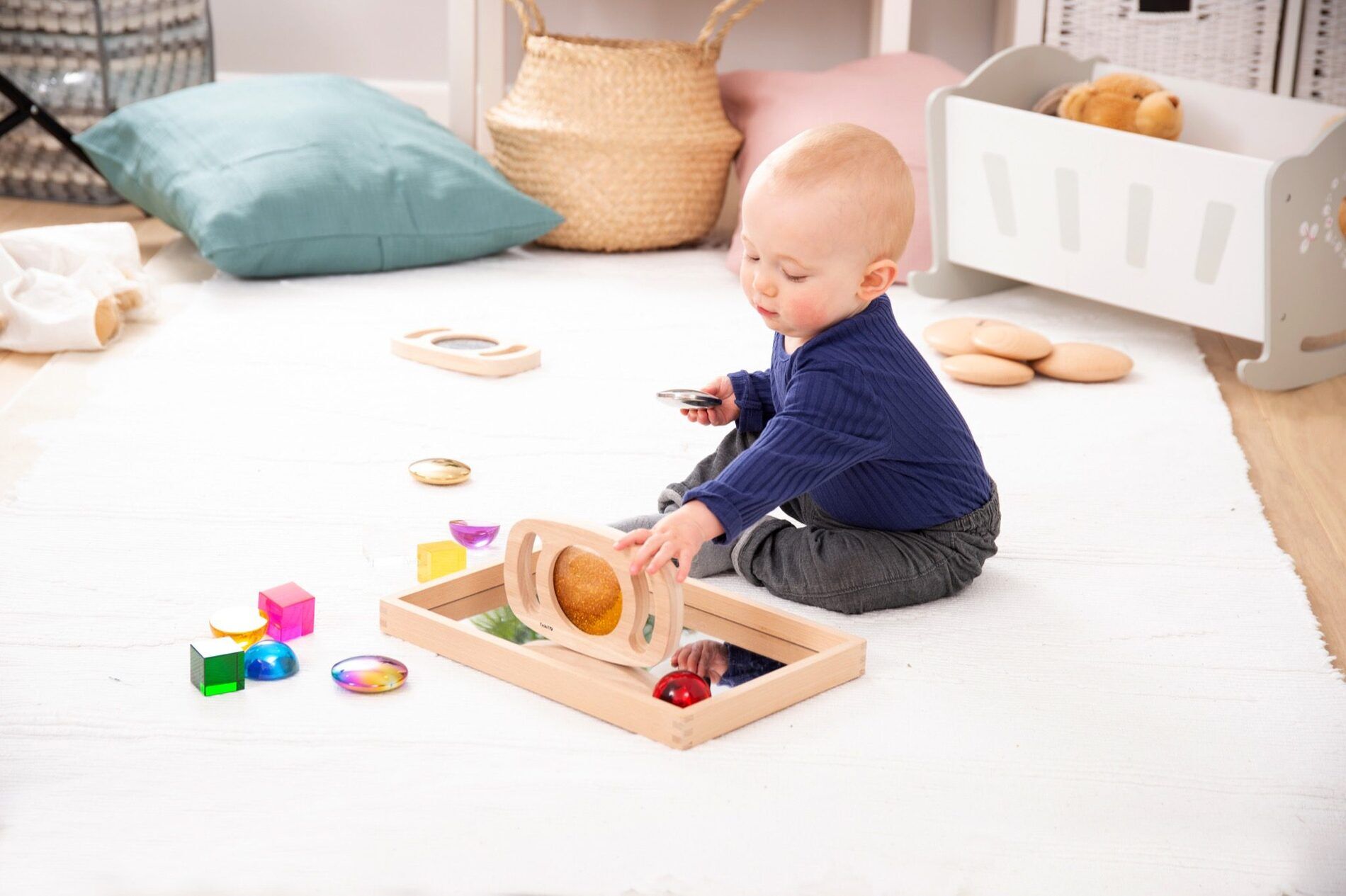 Onze nieuwe spiegelplateau van massief beukenhout is ideaal voor kinderen om te leren over reflectie en spiegeleffecten, om objecten vanuit verschillende hoeken te bekijken, voor het creëren van kleine wereldomgevingen en voor zelfobservatie en spraakontwikkeling.