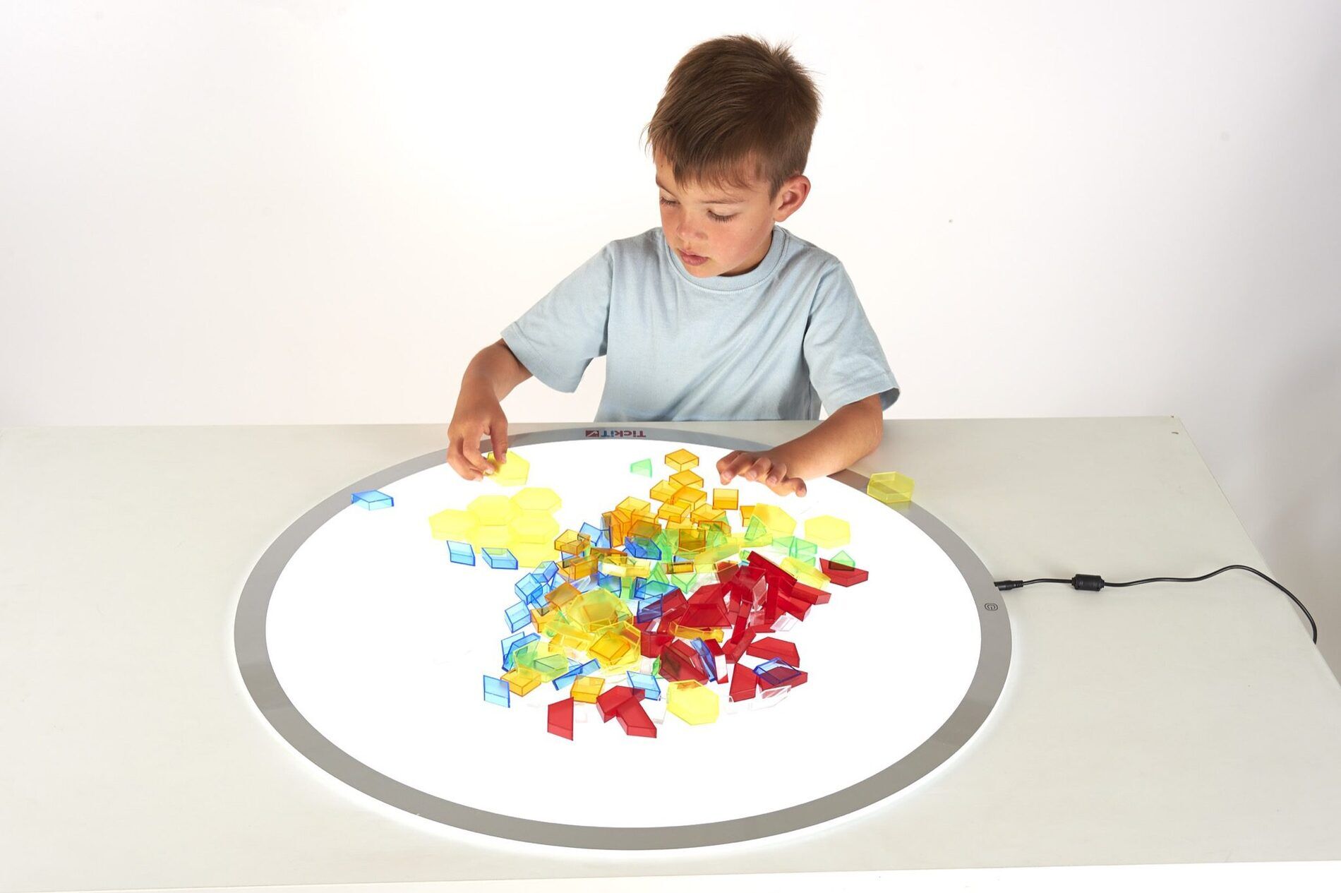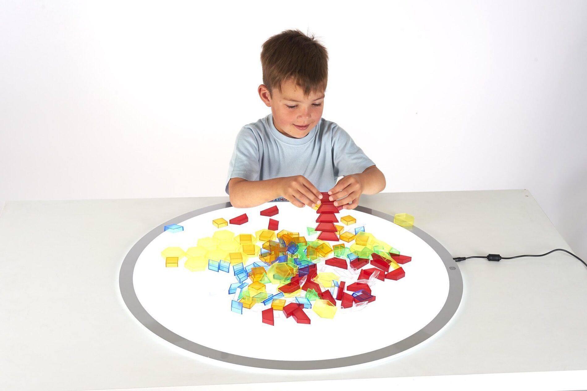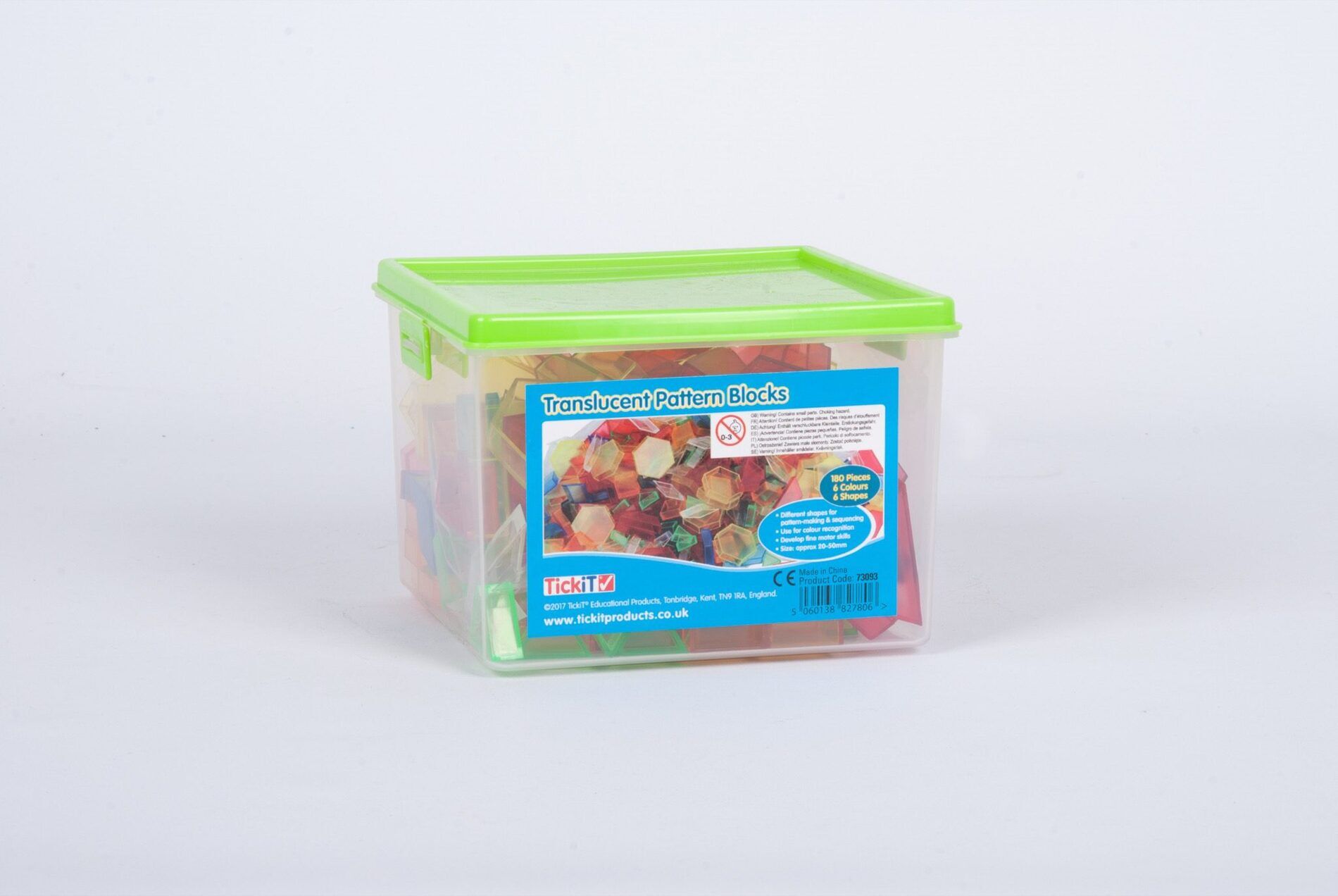 Deze doorzichtige plastic patroonblokken zijn verkrijgbaar in 6 vormen en 6 kleuren. Ze kunnen worden gebruikt voor patroon- en sequentieactiviteiten, om te tellen en sorteren, of voor kleur- en vormherkenning. Gebruik ze ook bij de LED Licht tablets! De set bevat gele zeshoeken, groene driehoeken, blauwe ruiten, oranje vierkanten, rode vierhoeken en doorzichtige ruiten. De vormen worden geleverd in een handige opbergcontainer.