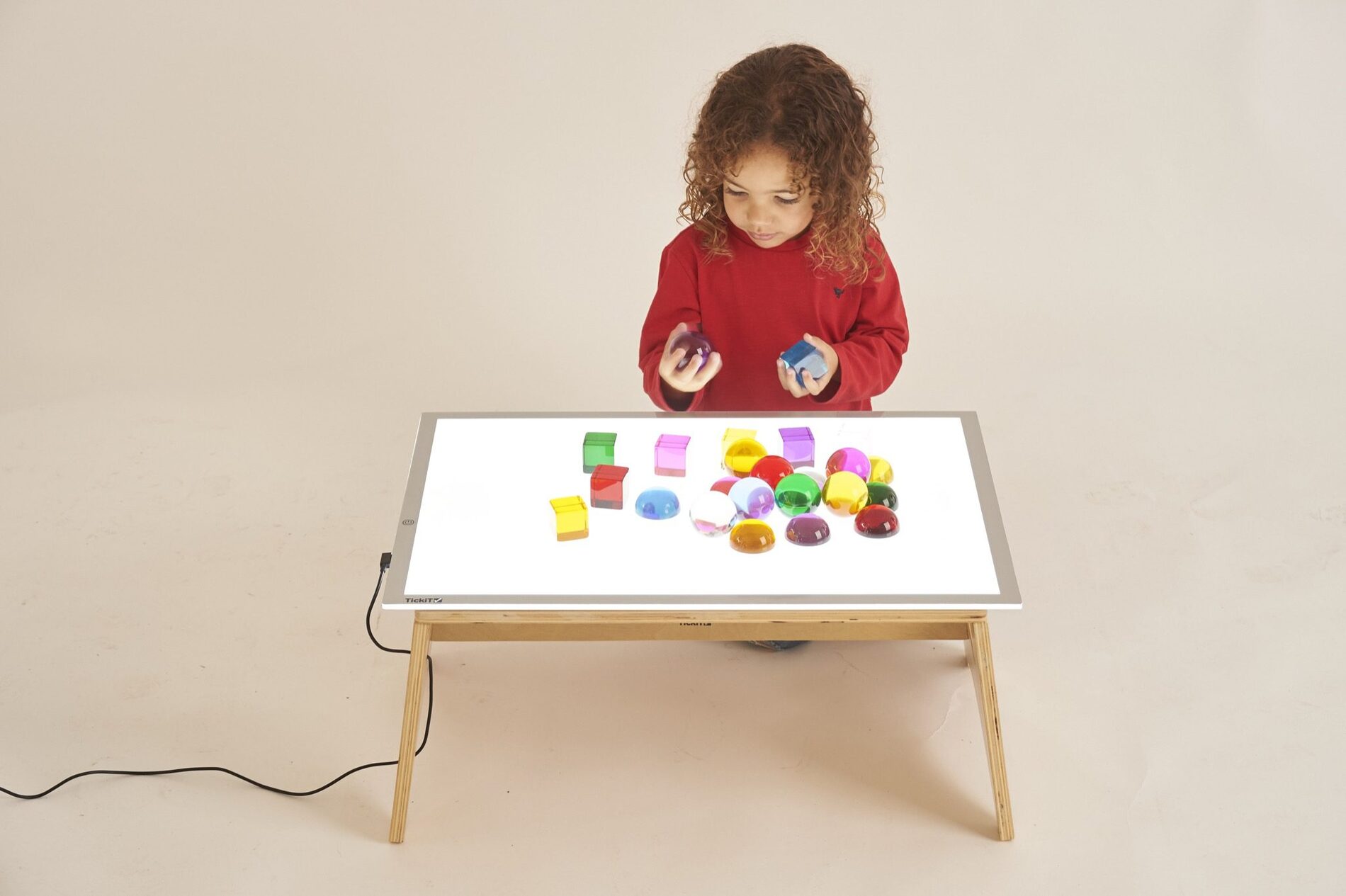 Deze lage houten tafel is voorzien van een A2 LED-lichtpaneel dat er bovenop ligt. De tafelpoten kunnen vastgezet worden met een inbussleutel. Onze LED-lichtpanelen zijn een essentiële en veelzijdige leermiddel voor verschillende vakken. Met een nieuwe anti-struikel magnetische connector en 3 lichtniveaus bieden ze een koele, schone en heldere verlichte achtergrond. Ze zijn ideaal voor het onderzoeken van licht, kleur en vorm, of voor gerichte groepswerkzaamheden in verschillende vakken.
