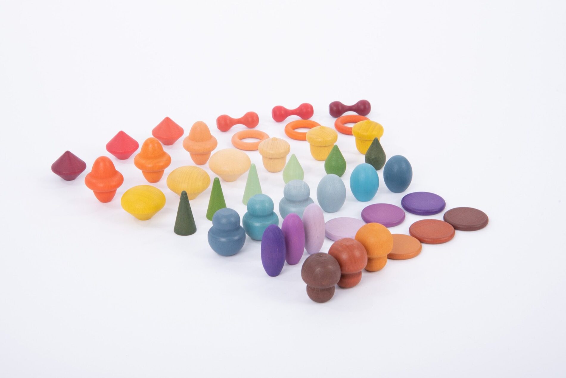 Een basis set van prachtige, gladde houten vormen geïnspireerd door de natuur en ontdekking. Elk vormpje is verkrijgbaar in 3 tinten van 7 organische kleuren die emotionele kenmerken en zintuigen symboliseren. Er zijn twee kleurversies van paddenstoelen / nelsons en stenen / tokens. De schatten zullen de verbeelding stimuleren, logica betrekken, creatief vermogen ontdekken, coördinatie ontwikkelen en fijne motoriek verbeteren. Inclusief katoenen opbergtas.