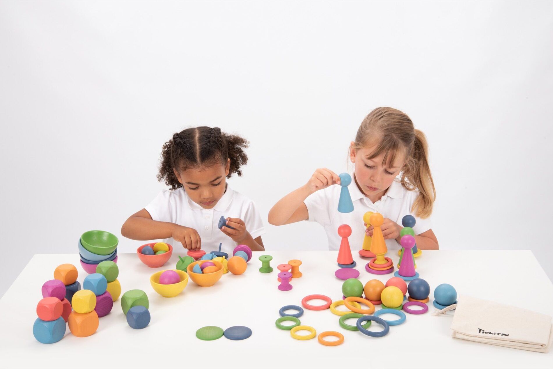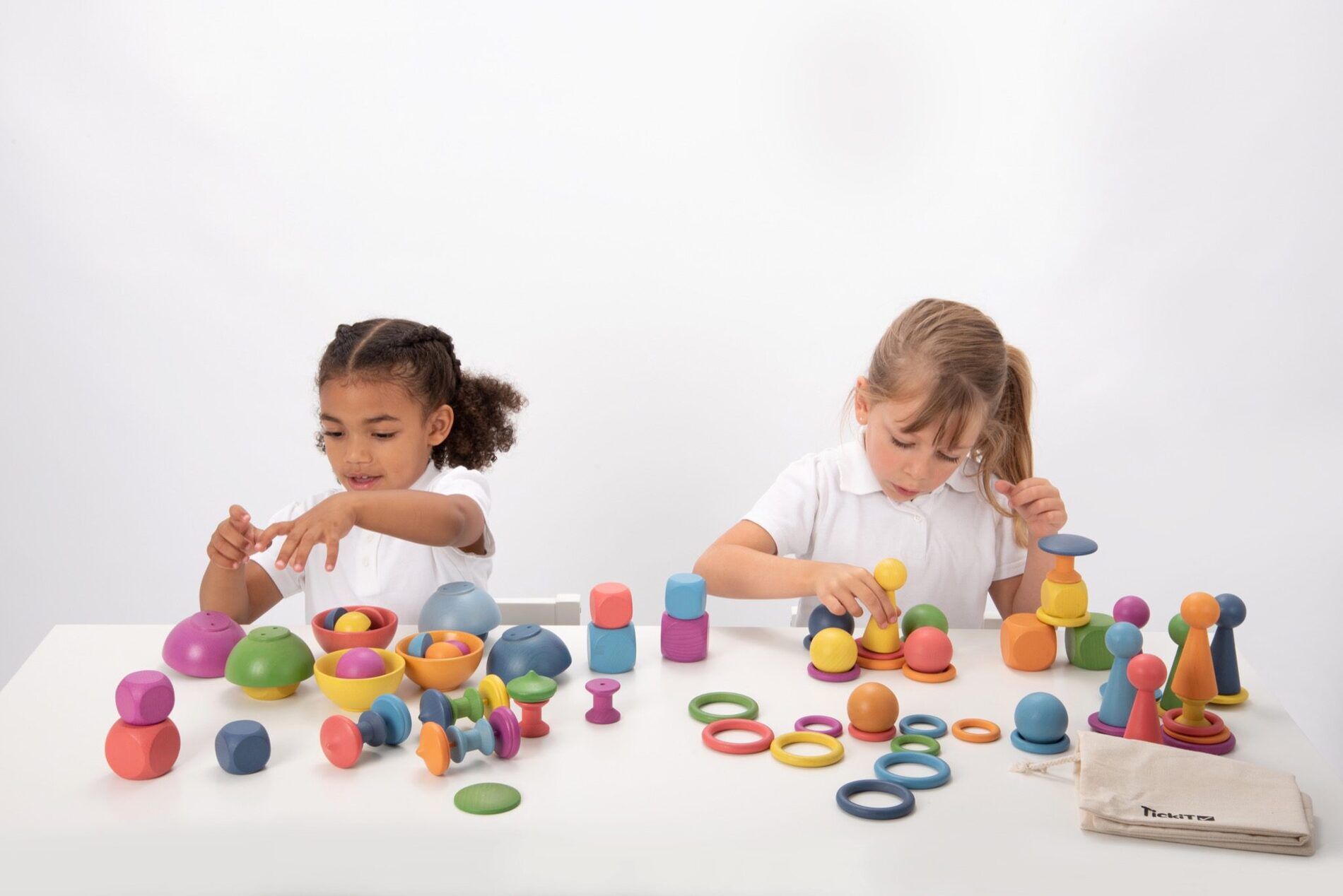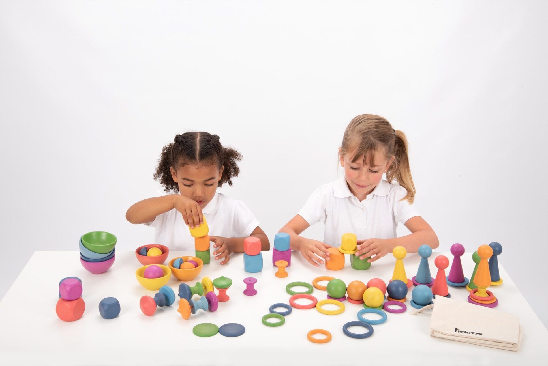 - Inhoud: 7 schijven (60 mm dia.), 7 spoelen (35 mm dia.), 7 kleine kubussen (40 mm), 7 grote kubussen (50 mm), 7 kleine ringen (48 mm dia.), 7 middelgrote ringen (56 mm dia.), 7 grote ringen (70 mm dia.), 7 ballen (50 mm dia.), 7 halve bollen (40 mm dia.), 7 figuren (100 mm), 7 kommen (92 mm dia.), 7 tolletjes (50 mm dia.), 1 katoenen zak.