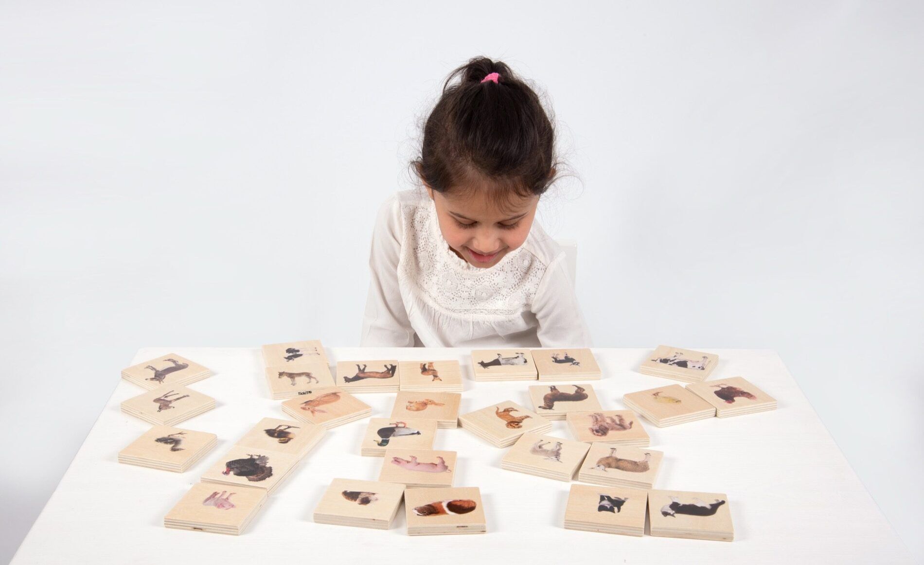 2. Als een geheugenspel - draai alle tegels om en probeer te onthouden waar de bijpassende dierenfamilieparen zich bevinden.