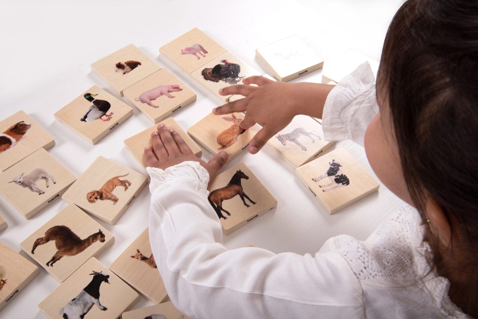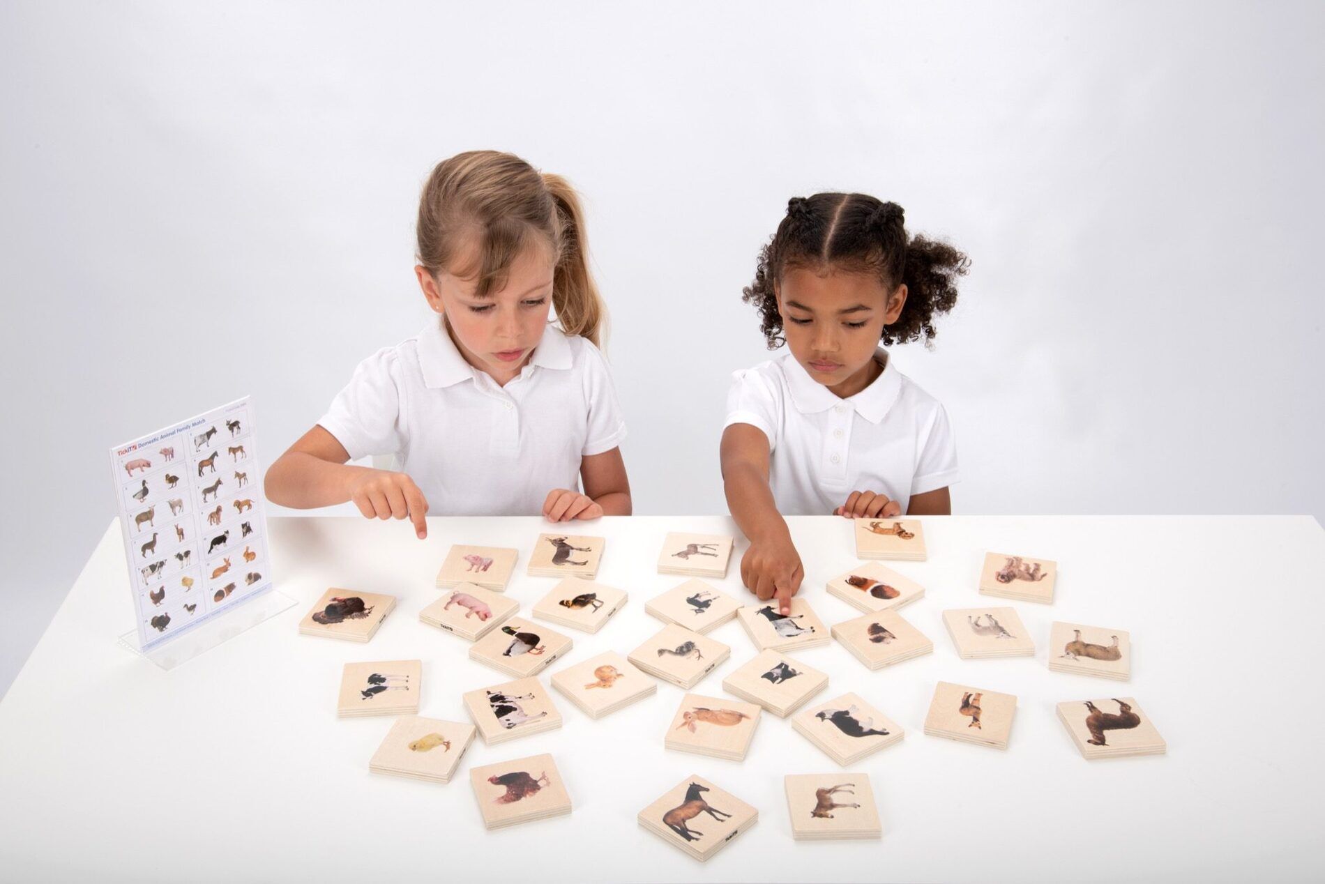 Met deze set van 14 paar gladde en tactiele vierkante tegels van berkenhoutfineer kunnen kinderen op een speelse manier de fascinerende dierenwereld verkennen. Elke tegel is aan één zijde bedrukt met gedetailleerde foto's van volwassen dieren en hun jongen. De stevige tegels zijn gemakkelijk vast te pakken, te draaien en om te draaien voor kleine handjes.