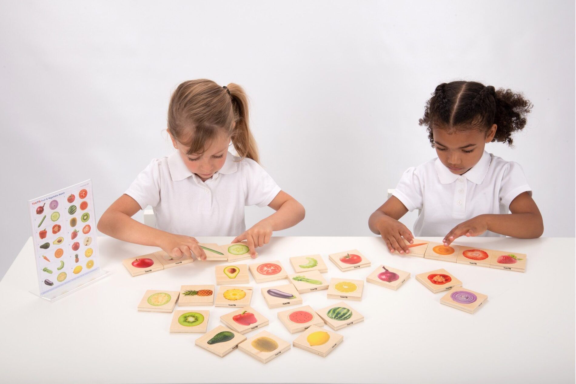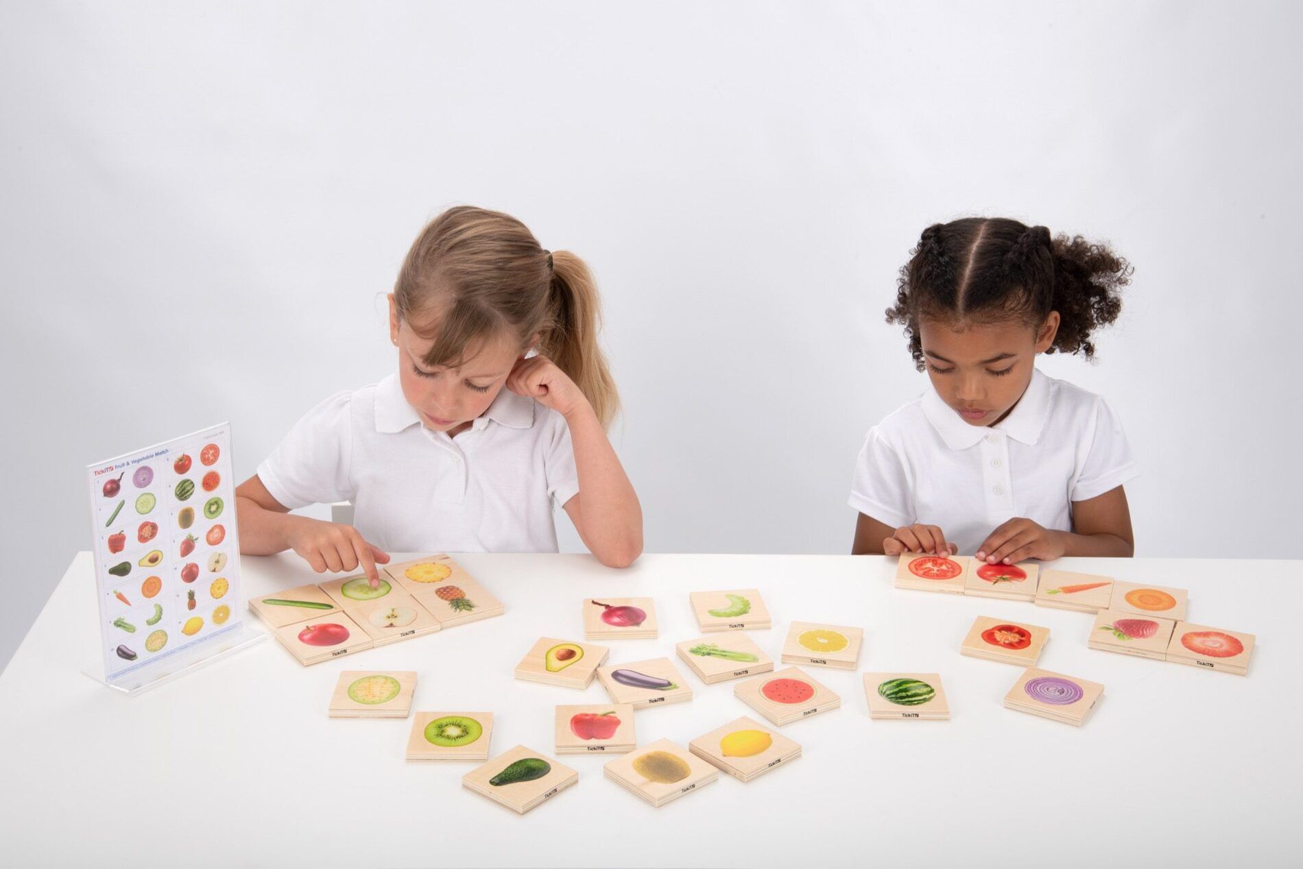 Kinderen kunnen de tegels gebruiken als een matchingspel, waarbij ze de hele vrucht of groente moeten matchen met de bijbehorende gesneden afbeelding. Ze kunnen ook een geheugenspel spelen door de tegels om te draaien en te proberen te onthouden waar de bijpassende paren zich bevinden. Daarnaast kunnen ze de tegels sorteren op basis van verschillende criteria, zoals kleur, variëteit (fruit of groente), zaden / geen zaden, textuur, zoete / zure / hartige smaak of op volgorde van grootte.