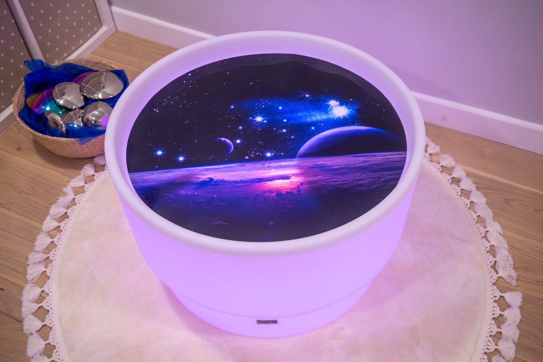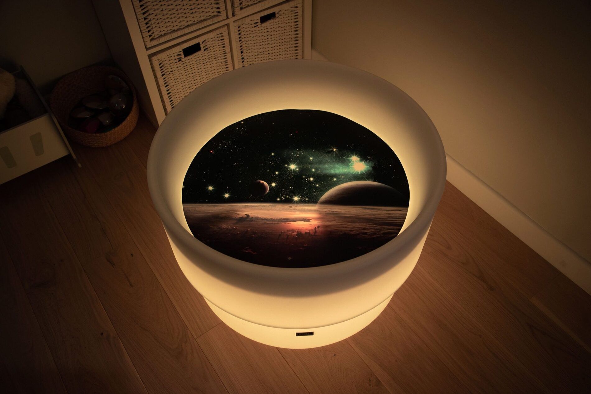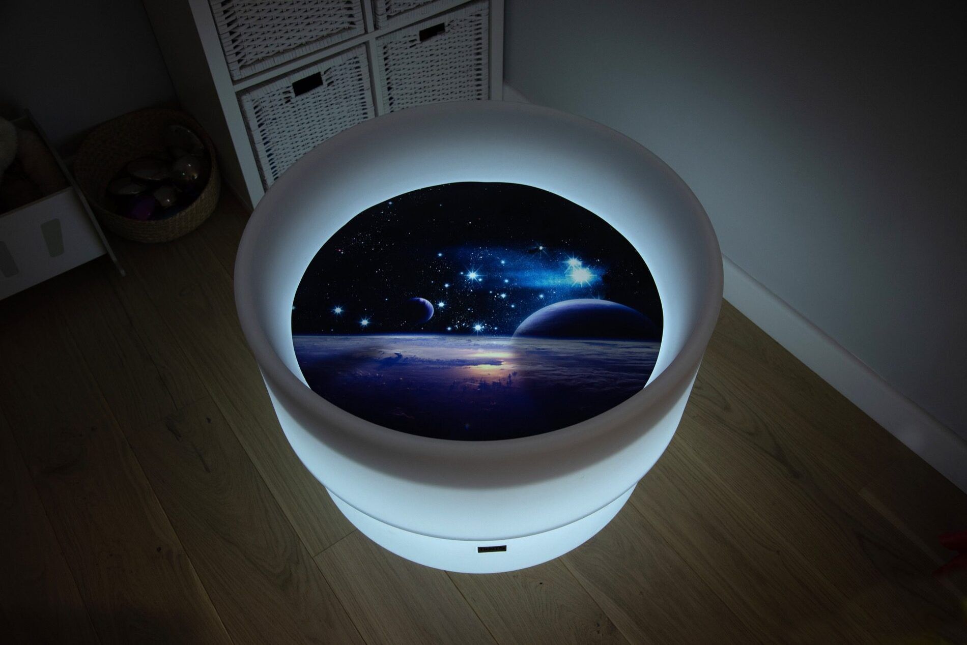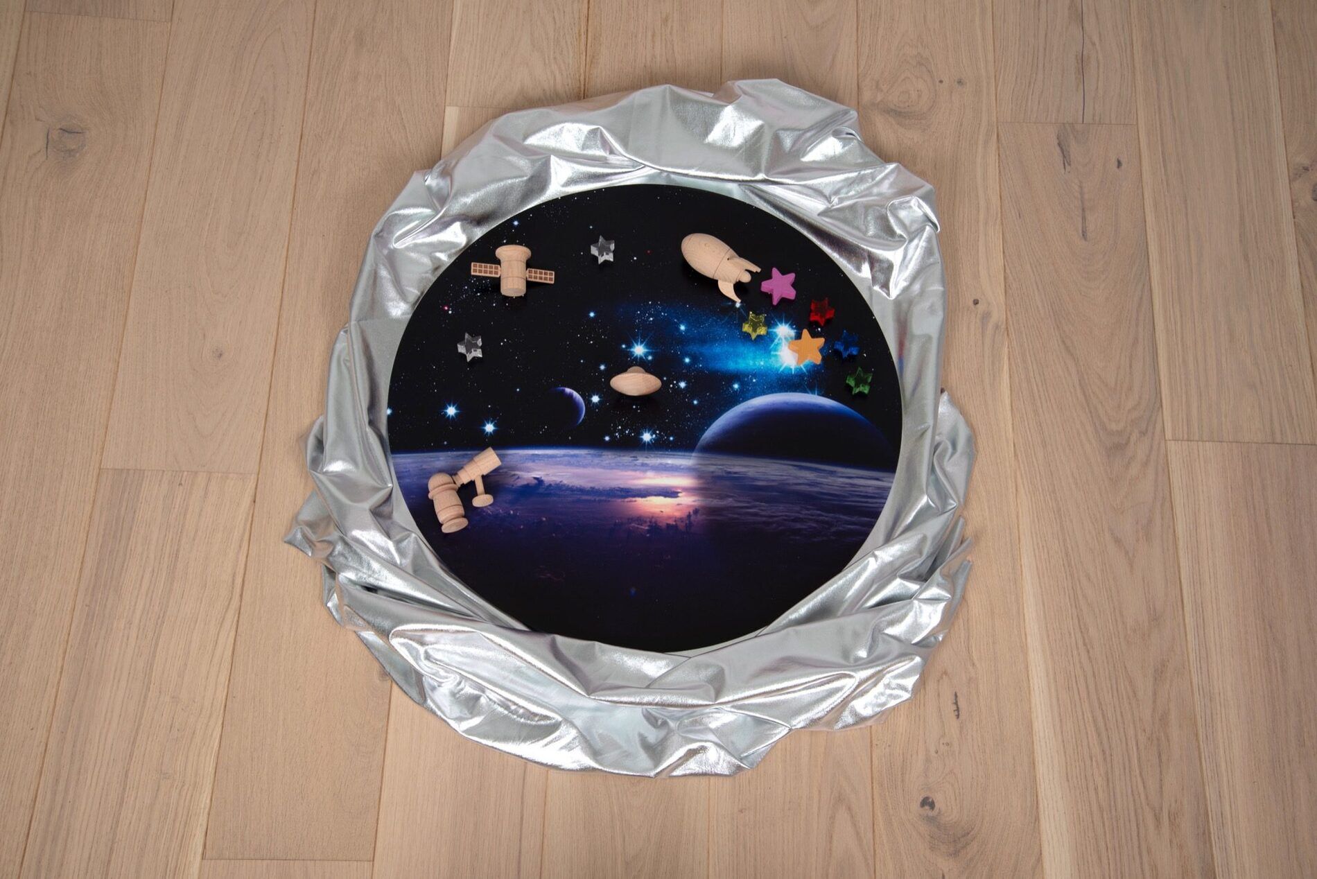 De speelmat past perfect in onze Waterdichte draagbare lichttafel en de Tickit LED Lichtpaneel – Licht tablet rond. Gemaakt van duurzaam polyester, is de mat slijtvast en gemakkelijk schoon te vegen - de ideale accessoire voor spelletjes in het klein, verhalen vertellen en sensorische verkenning. Door de semi-transparante eigenschappen werkt de speelmat vooral goed op een lichtpaneel of sfeertafel, omdat het licht erdoorheen schijnt en de sterren en planeten verlicht. De gekozen lichtbron beïnvloedt de uitstraling van de mat op verschillende manieren: door sommige kleuren van het landschap te veranderen, de kleuren intenser te maken of zelfs sommige kleuren te laten oplichten - een fascinerende manier om kleur te verkennen tijdens het spelen