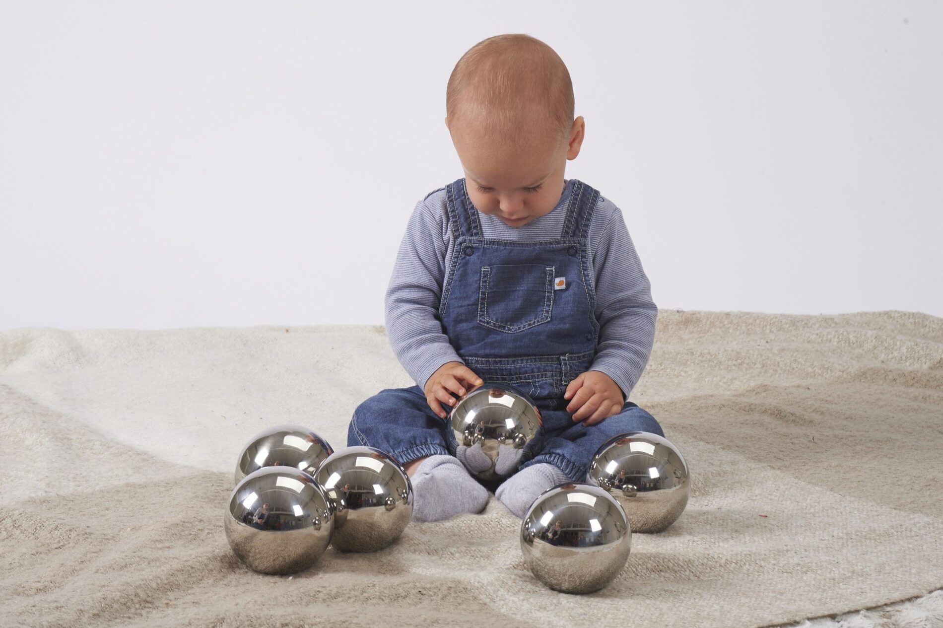 Het met de hand afgewerkte glanzende spiegeloppervlak zorgt voor een vervormde fish-eye lens reflectie die fascinerend is voor kinderen om te observeren. De ballen zijn robuust gebouwd van duurzaam roestvrij staal, zijn lichtgewicht, glad en tastbaar om vast te houden en kunnen bijzonder aantrekkelijk zijn voor kinderen met speciale behoeften of voor degenen die inspiratie nodig hebben in creatieve taal.