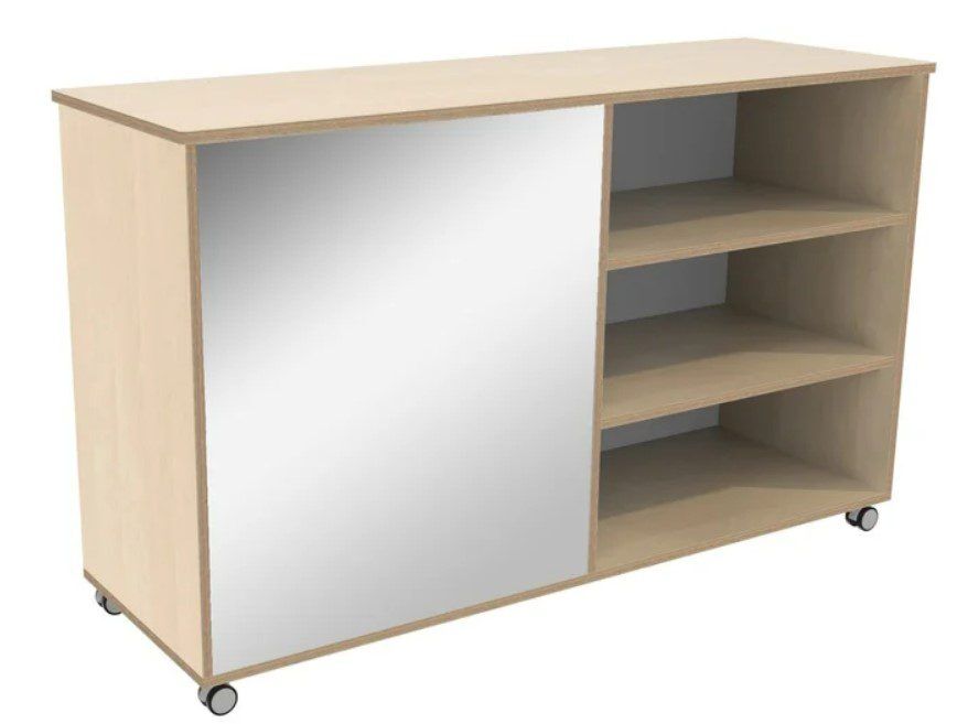 De vakkenkast is aan de ene kant voorzien van een plexiglas spiegel, aan de andere kant is een krijtbord aanwezig.