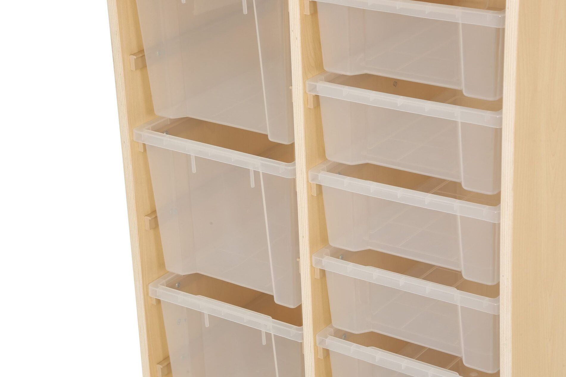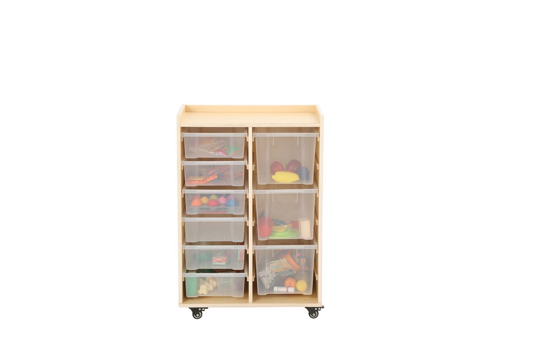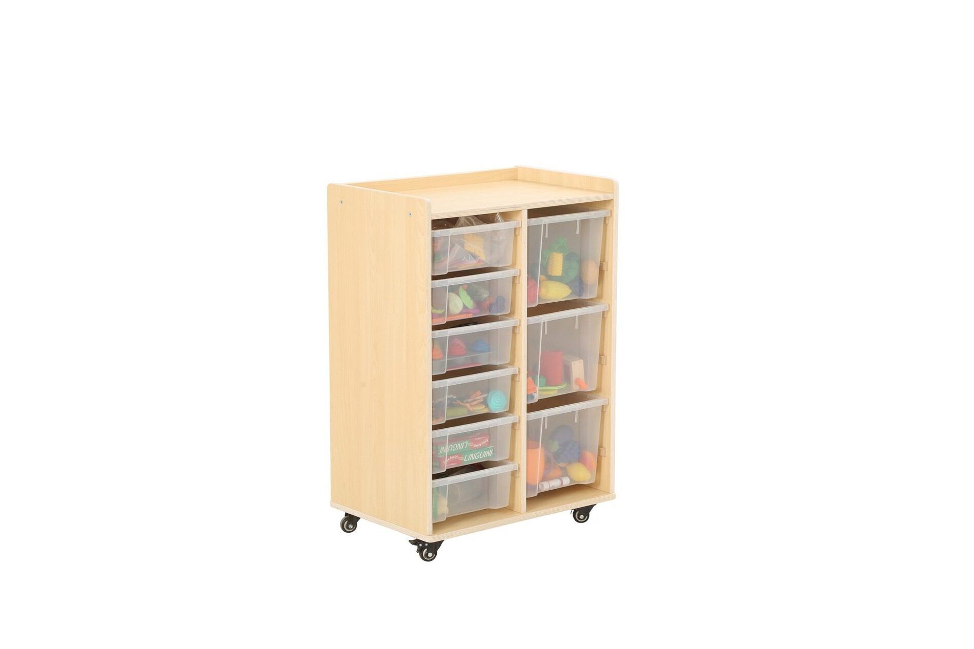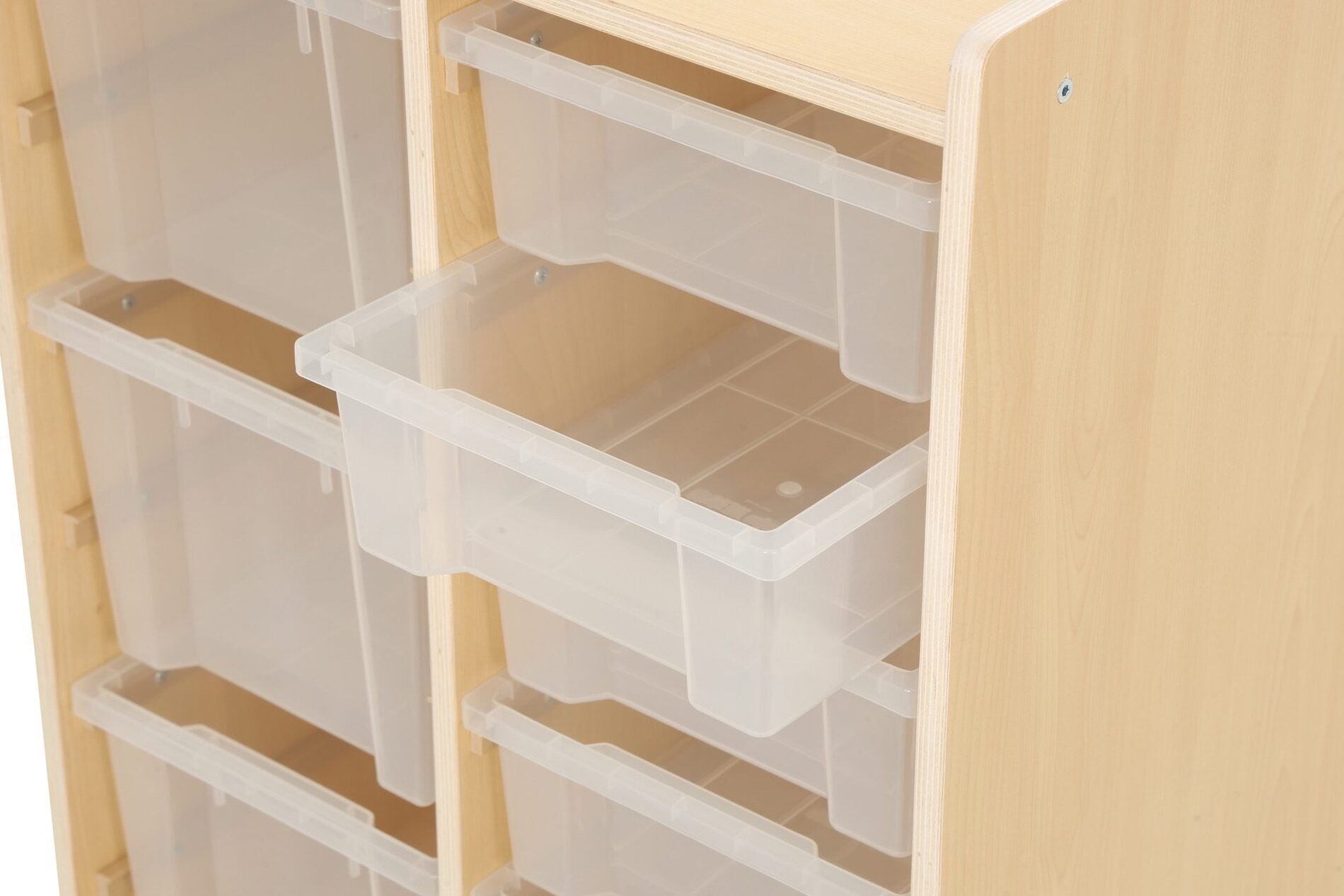 De kast heeft twee rijen waarin in totaal 6 kleine bakken en 3 grote bakken van duurzaam polypropyleen passen. Deze bakken bieden voldoende opbergruimte voor speelgoed, boeken en andere materialen die nodig zijn voor educatieve activiteiten.