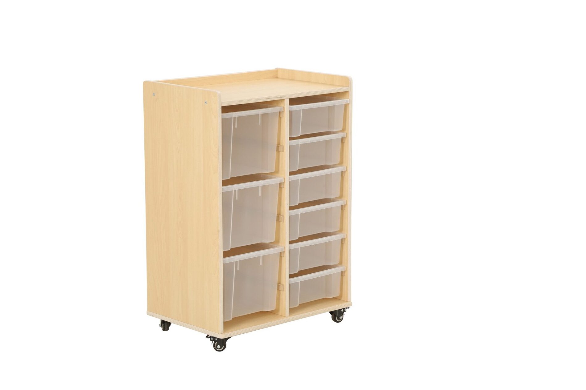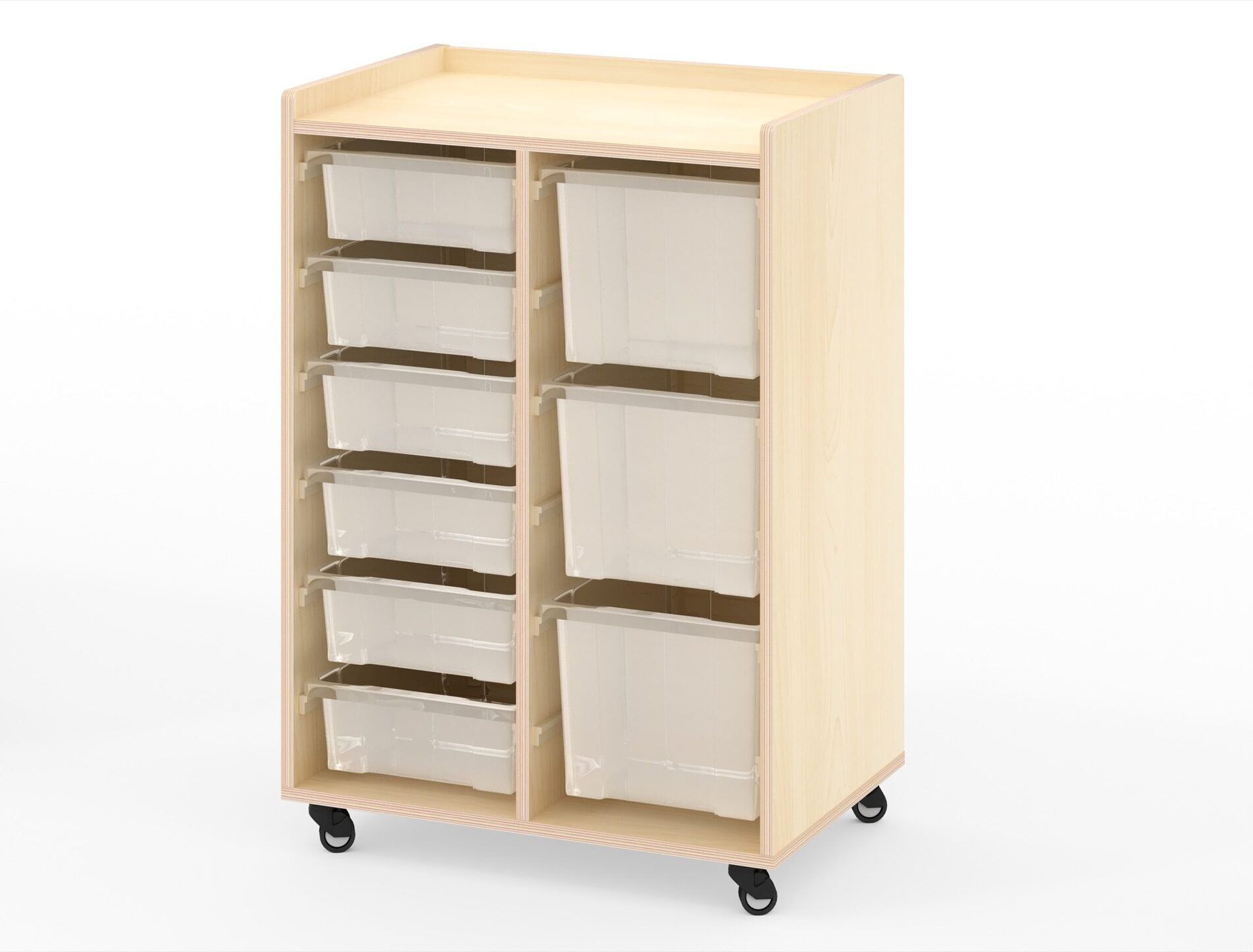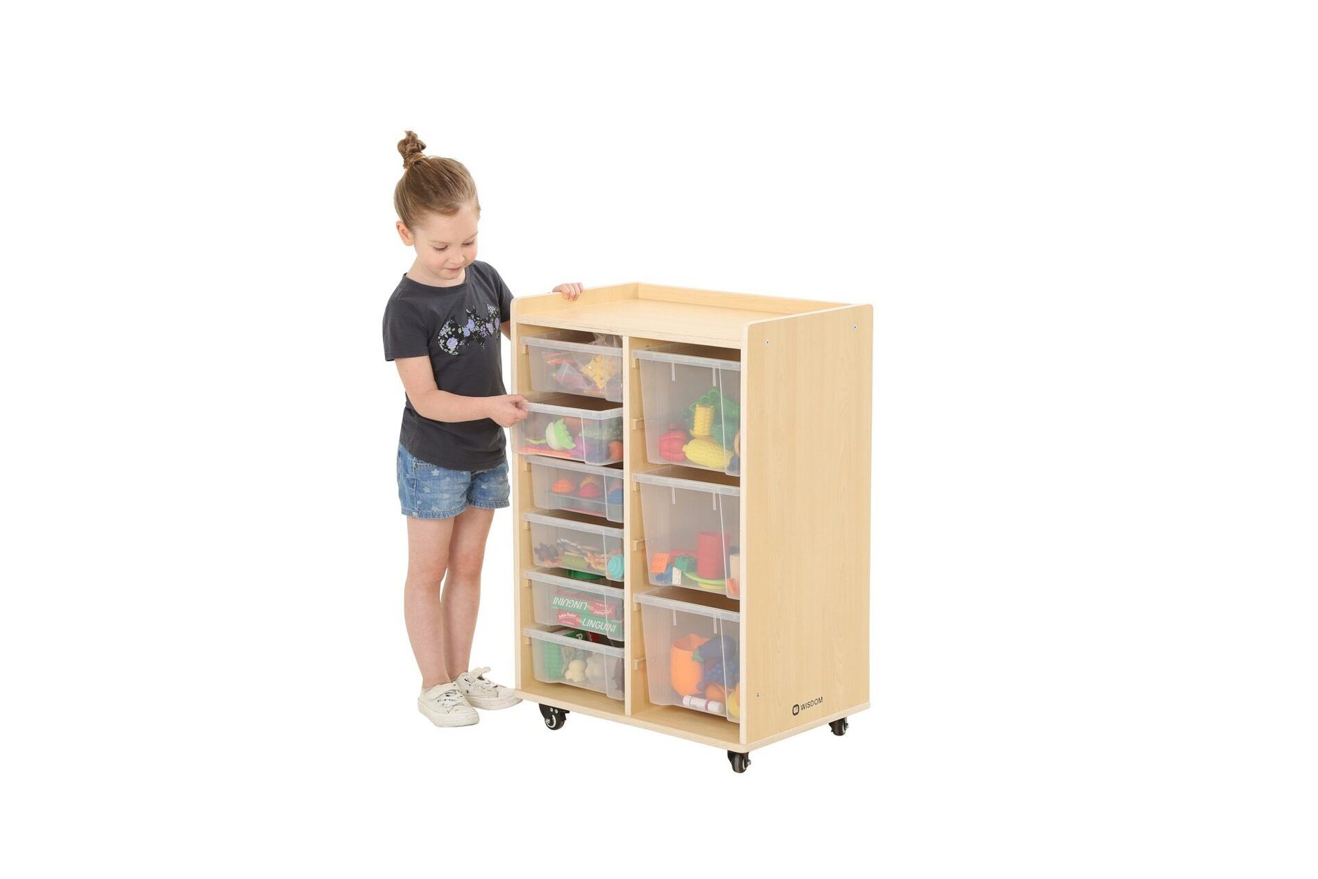 De kast heeft twee rijen waarin in totaal 6 kleine bakken en 3 grote bakken van duurzaam polypropyleen passen. Deze bakken bieden voldoende opbergruimte voor speelgoed, boeken en andere materialen die nodig zijn voor educatieve activiteiten.