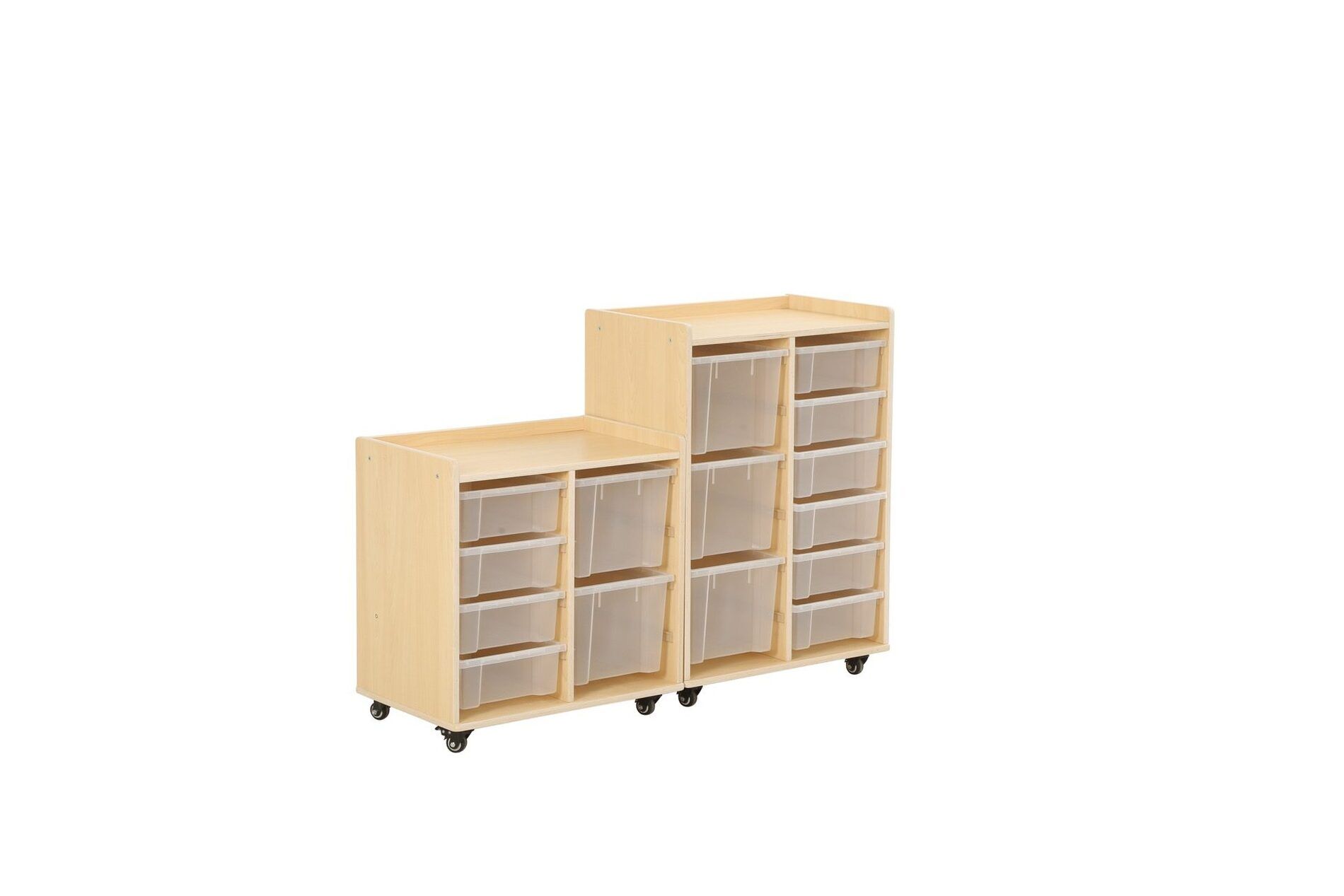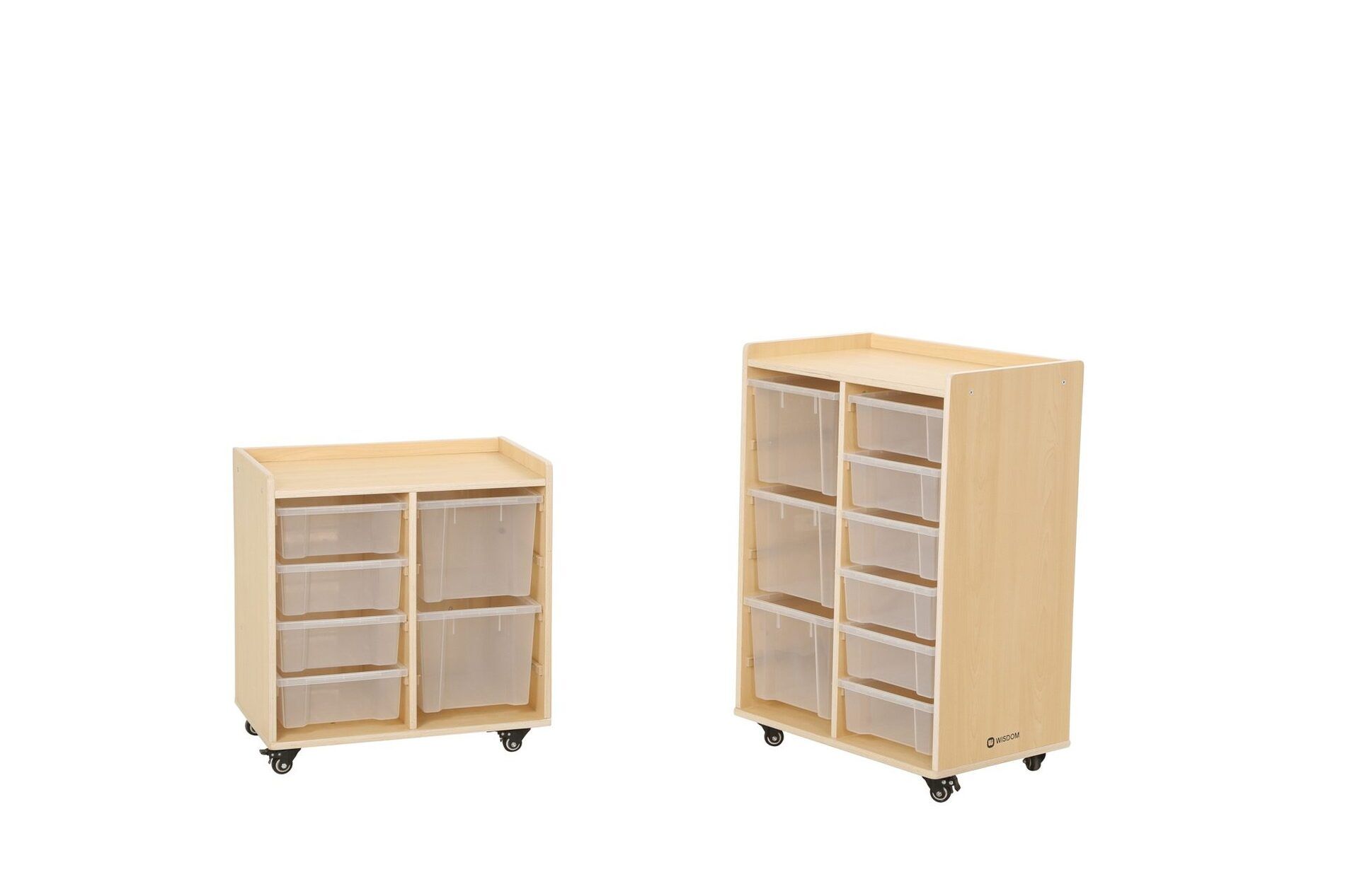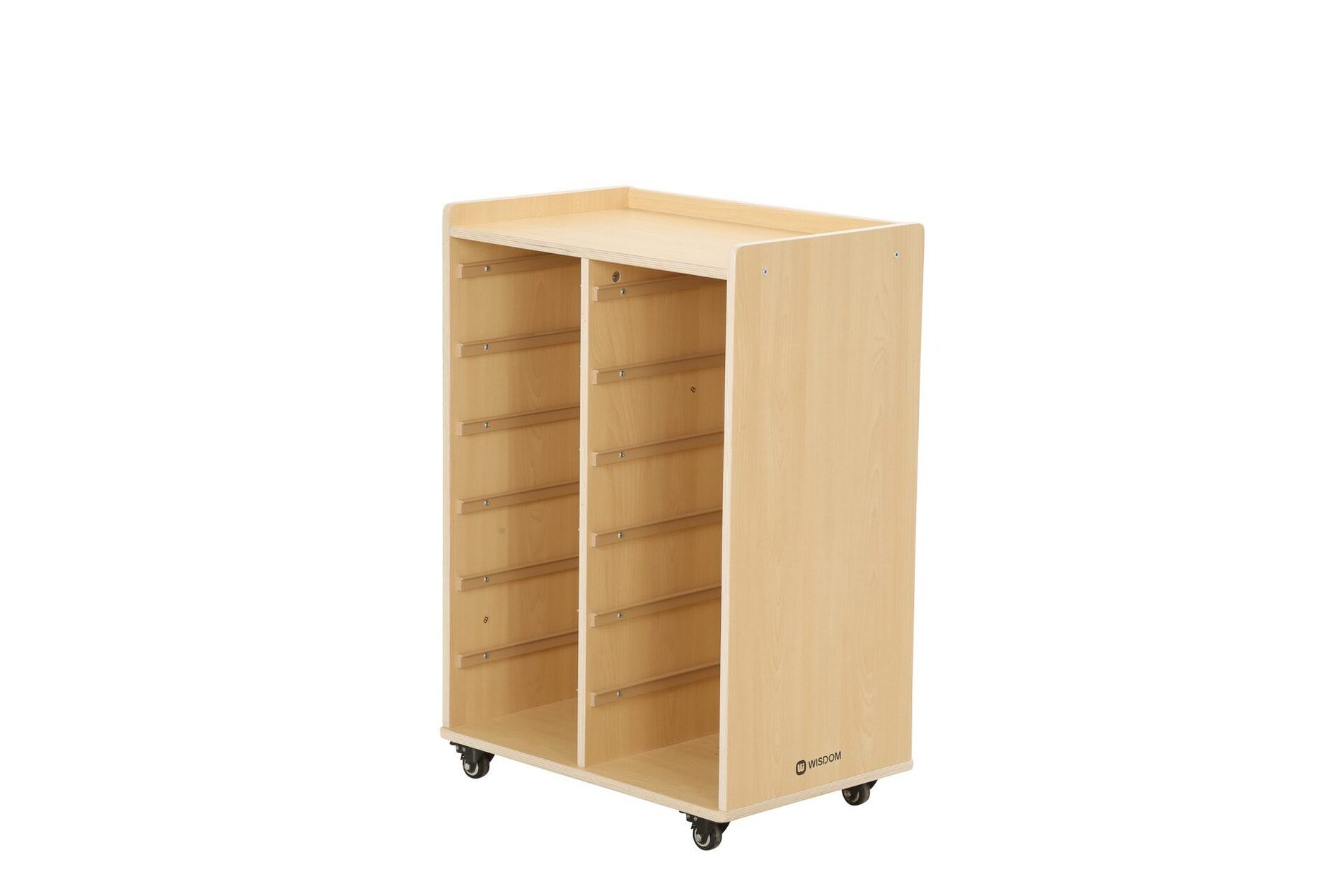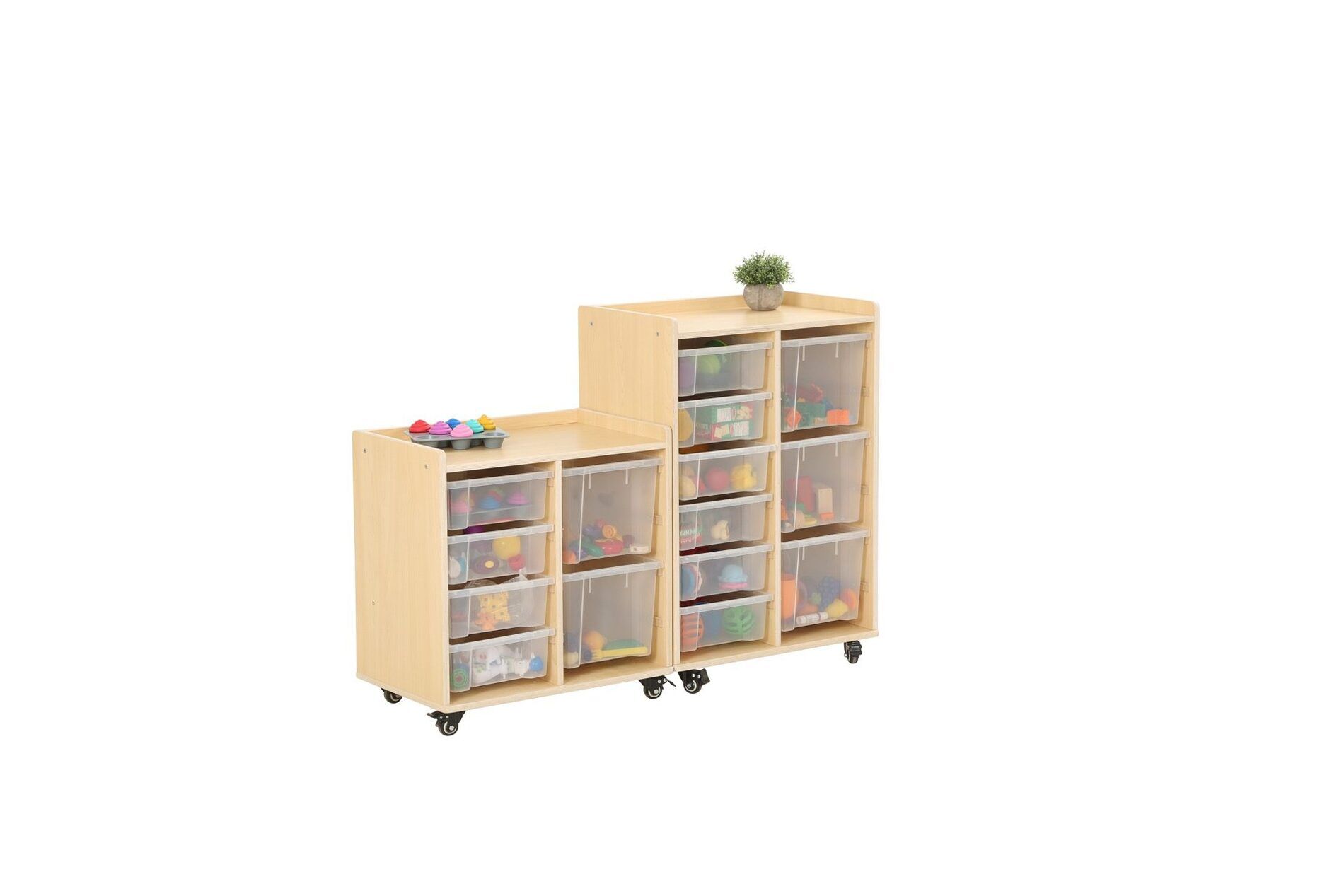 De kast heeft twee rijen waarin in totaal 6 kleine bakken en 3 grote bakken van duurzaam polypropyleen passen. Deze bakken bieden voldoende opbergruimte voor speelgoed, boeken en andere materialen die nodig zijn voor educatieve activiteiten.