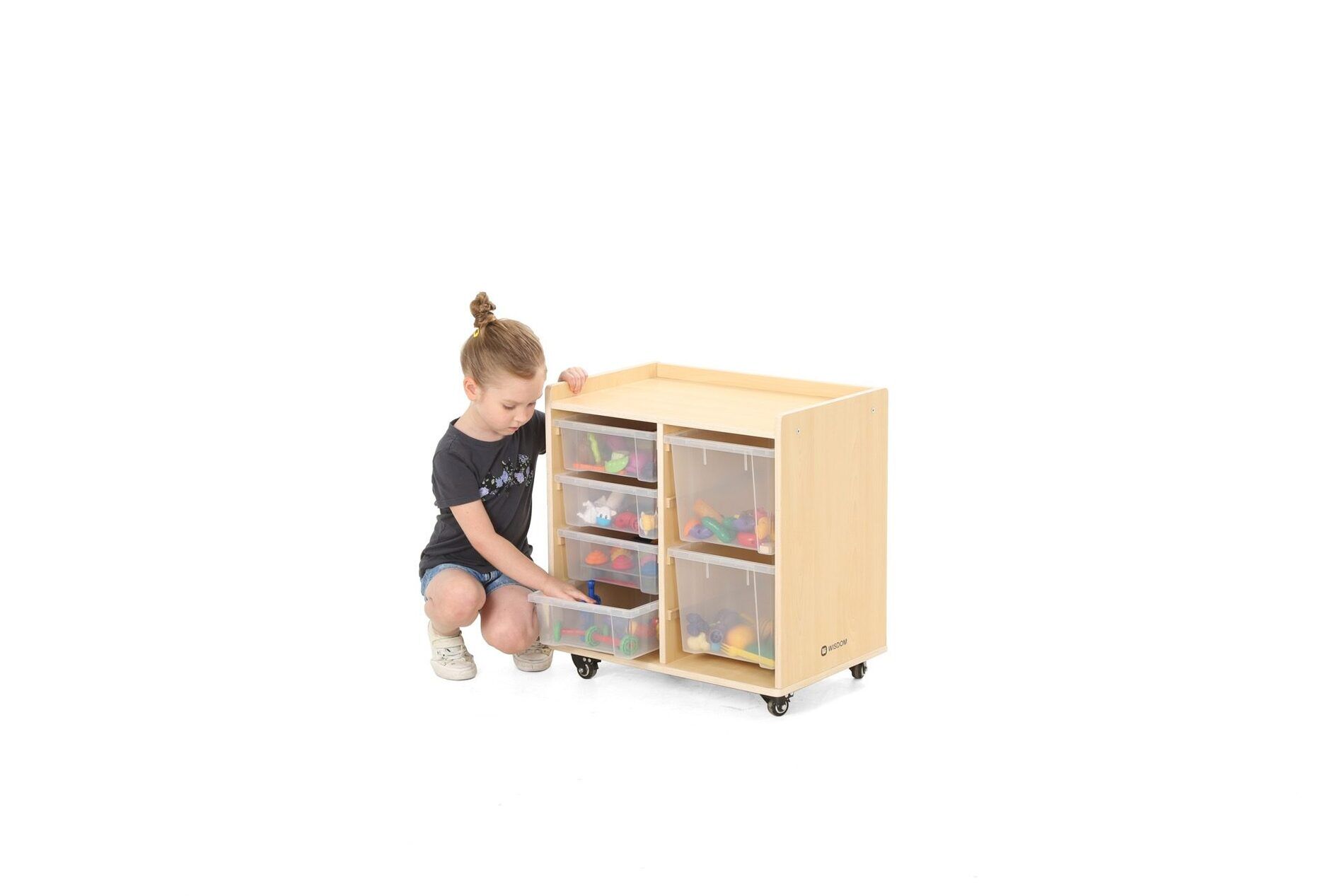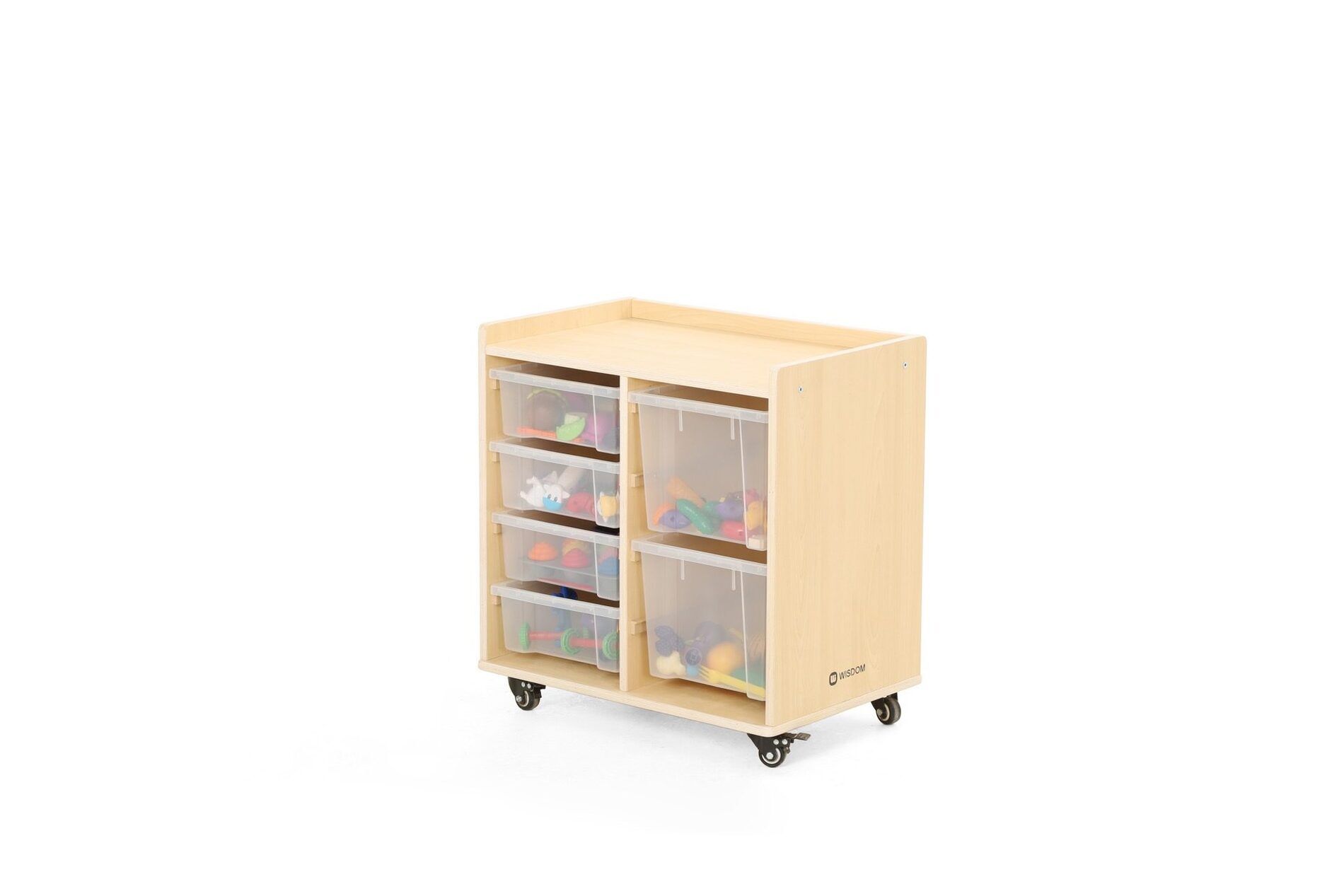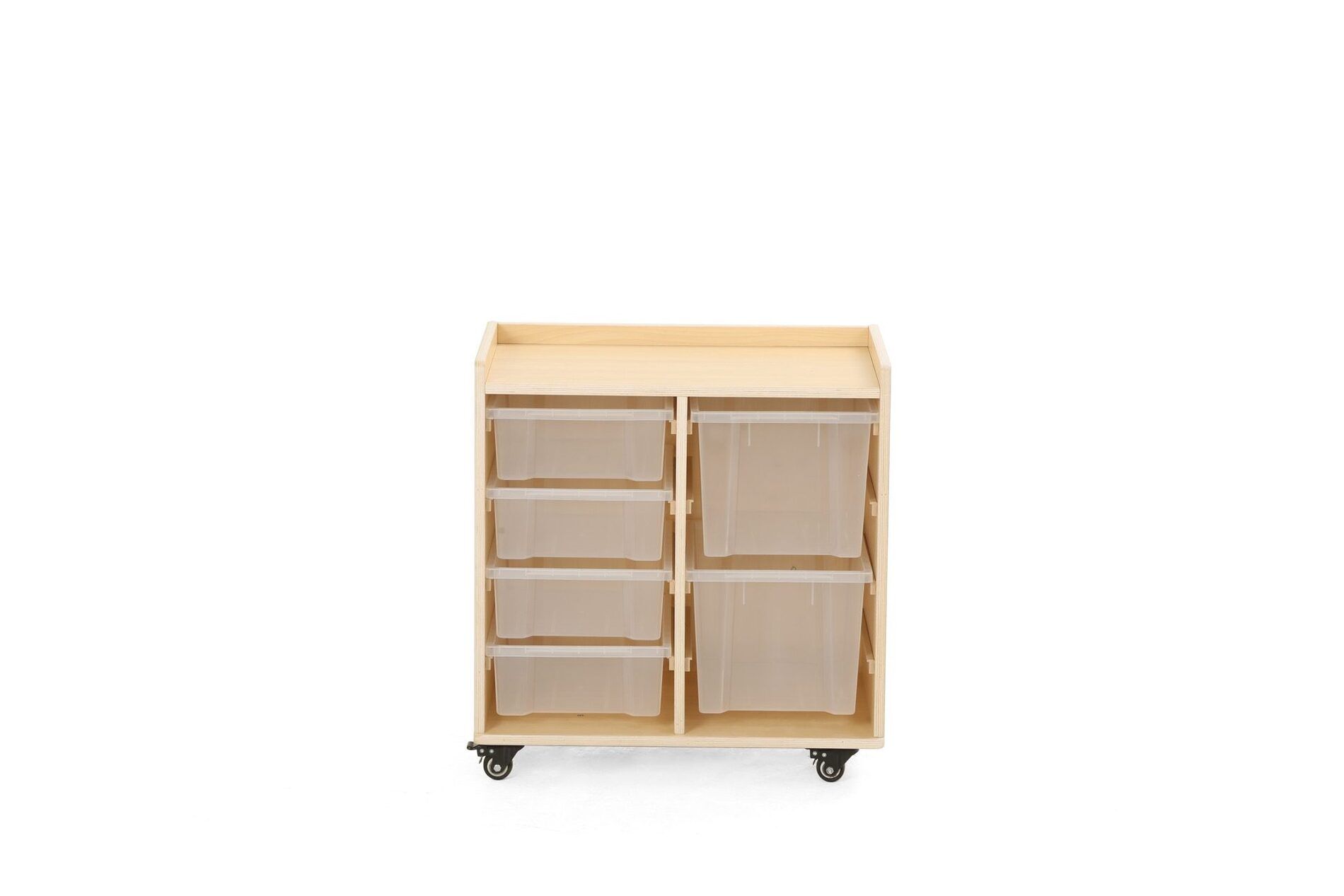 De kast heeft twee rijen waarin in totaal 4 kleine bakken en 2 grote bakken van duurzaam polypropyleen passen. Deze bakken bieden voldoende opbergruimte voor speelgoed, boeken en andere materialen die nodig zijn voor educatieve activiteiten.