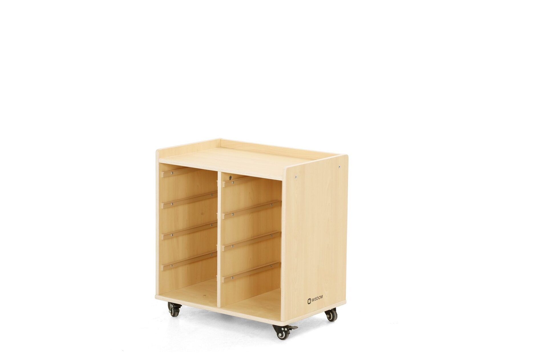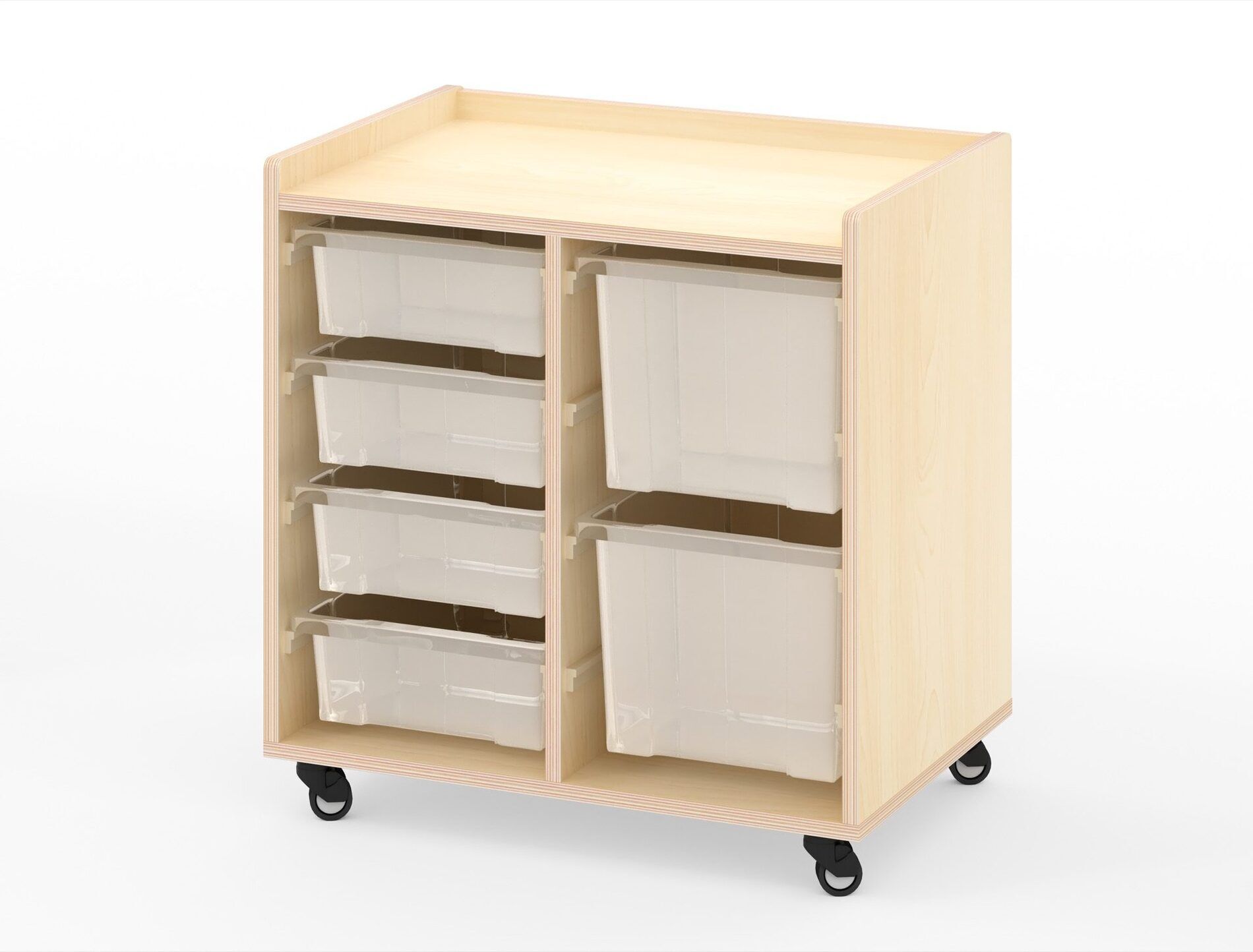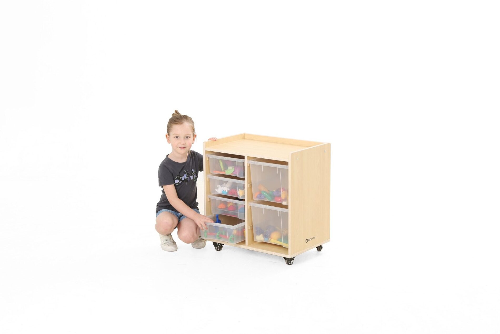 De kast heeft twee rijen waarin in totaal 4 kleine bakken en 2 grote bakken van duurzaam polypropyleen passen. Deze bakken bieden voldoende opbergruimte voor speelgoed, boeken en andere materialen die nodig zijn voor educatieve activiteiten.