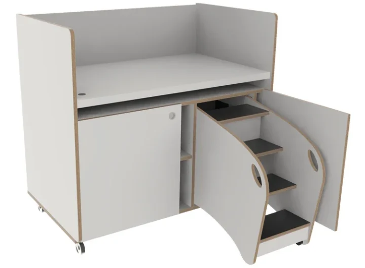 Witte extra brede commode, verrijdbaar. De trap is opgeborgen in het rechterkastje en kan eenvoudig aangetrokken en stevig vastgezet worden. De commode is elektrisch in hoogte verstelbaar (85-105 cm).