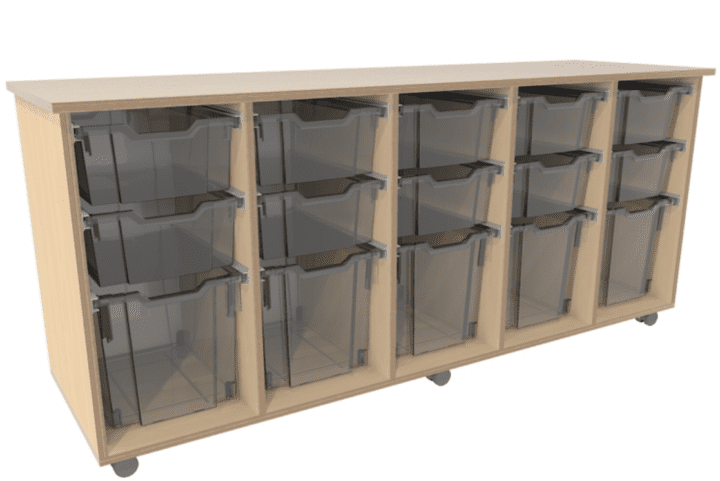 Verrijdbare lage kast inclusief 10 medium transparante bakken en 5 large transparante bakken.