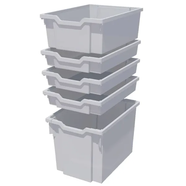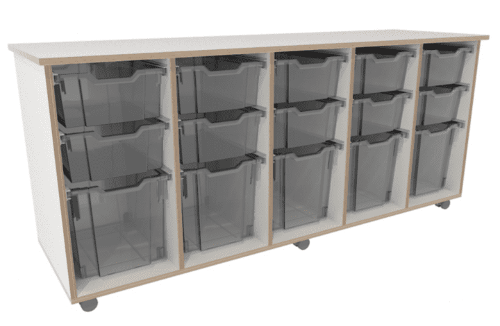 Verrijdbare lage kast inclusief 10 medium transparante bakken en 5 large transparante bakken.