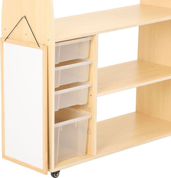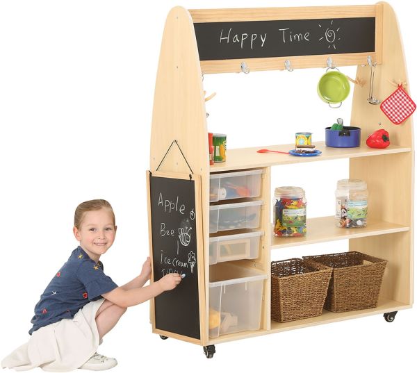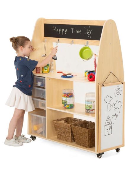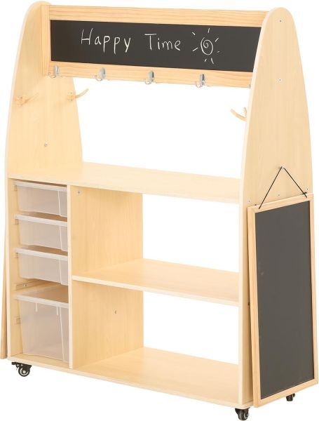 Uitgerust met drie kleine polypropyleen dozen en een ruime opbergbox, biedt de mobiele speelstation voldoende opbergruimte voor speelgoed, boeken en knutselmateriaal. Door gerichte opslag wordt niet alleen orde gehouden, maar ook het gemeenschappelijk gebruik en de organisatie van de ruimte ondersteund. Daarnaast heeft de speelstation ruime opbergvakken die perfect geschikt zijn om materialen en speelbenodigdheden overzichtelijk te organiseren. Dit geeft kinderen gemakkelijke toegang tot alles wat ze nodig hebben voor hun activiteiten. Een bijzonder slimme toevoeging is het bord aan de zijkant van de speelstation, dat zowel als krijtbord als whiteboard kan dienen.