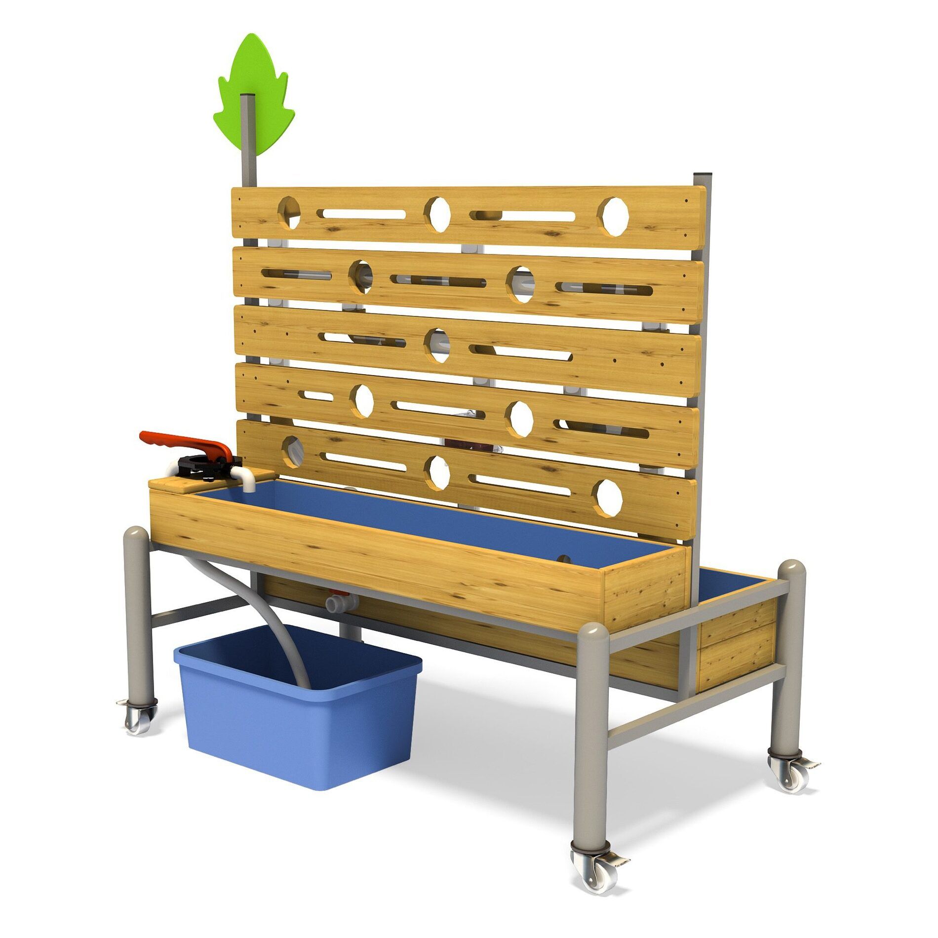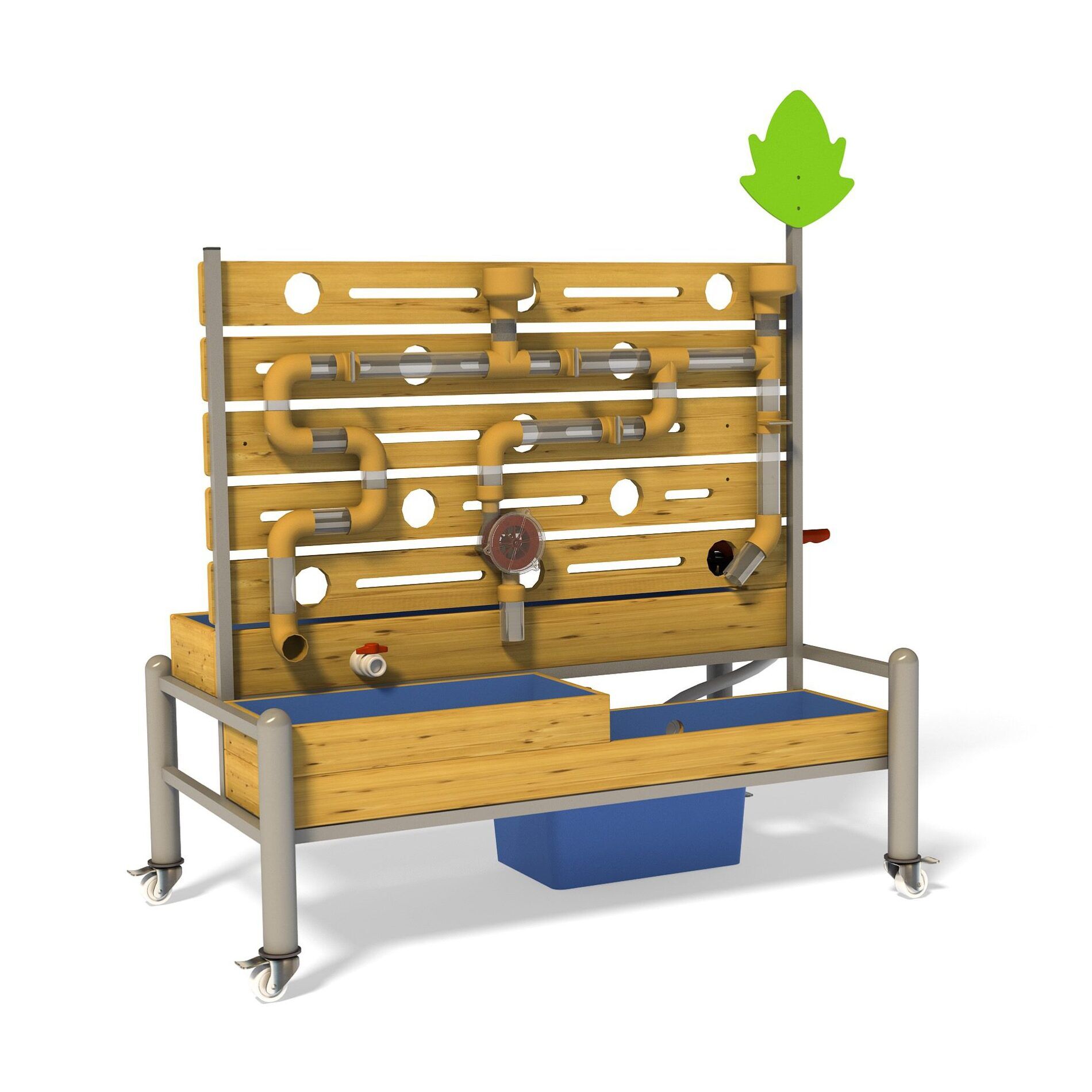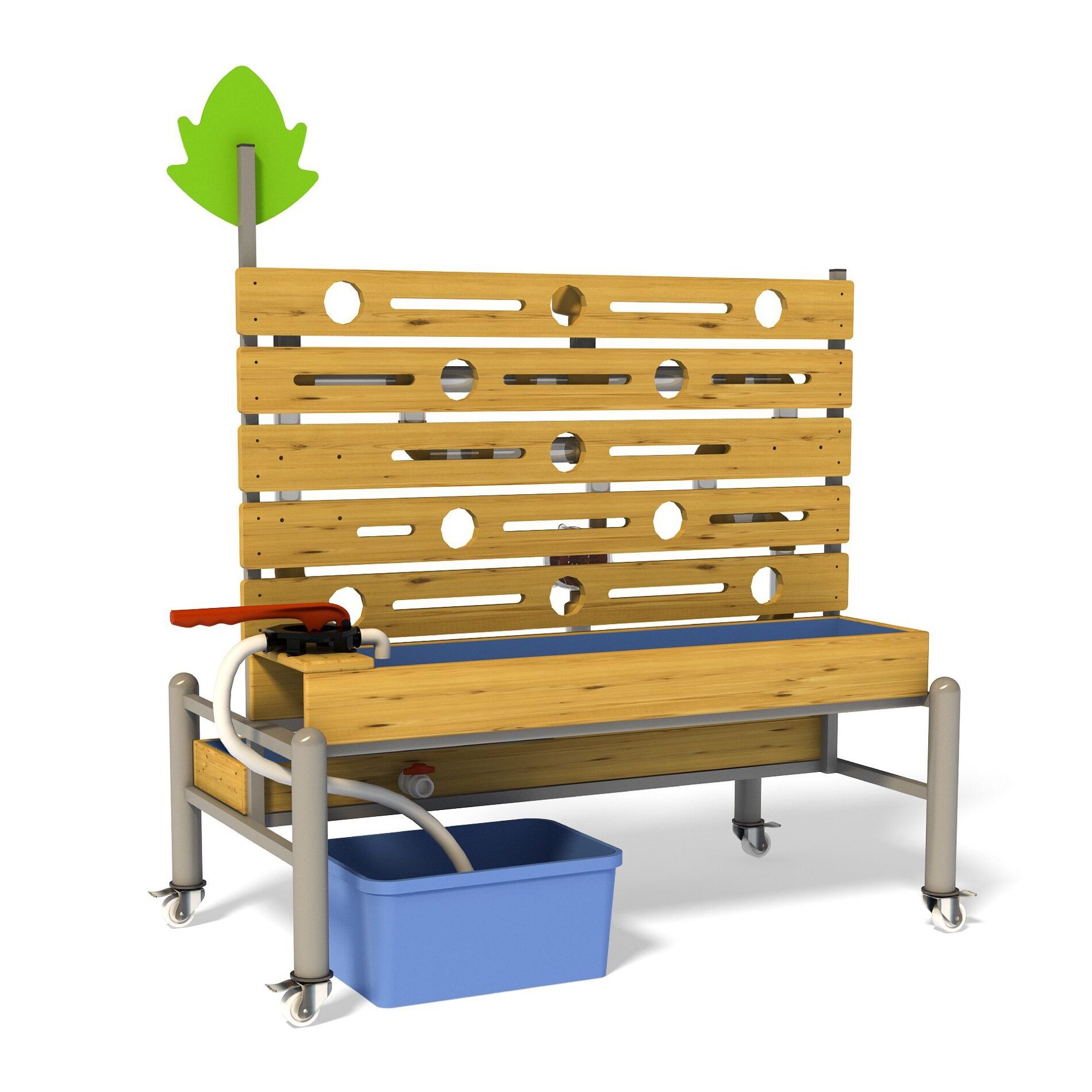 Dit waterspeelbord bestaat uit drie ruime bakken die voldoende ruimte bieden om te spetteren en te kliederen. Kinderen zullen enthousiast zijn wanneer ze de handpomp gebruiken om water in de buizen te pompen en gespannen kijken hoe het door de verschillende verbindingsstukken stroomt. Een indrukwekkend waterrad zorgt voor extra plezier door te draaien op het stromende water. De flexibiliteit van deze installatie stelt kinderen in staat om hun creativiteit de vrije loop te laten en te experimenteren met verschillende waterspellen. Of ze nu bootjes laten drijven, kleine stuwmeren bouwen of gewoon genieten van het koele water - deze installatie biedt talloze mogelijkheden voor gevarieerde speelmomenten.