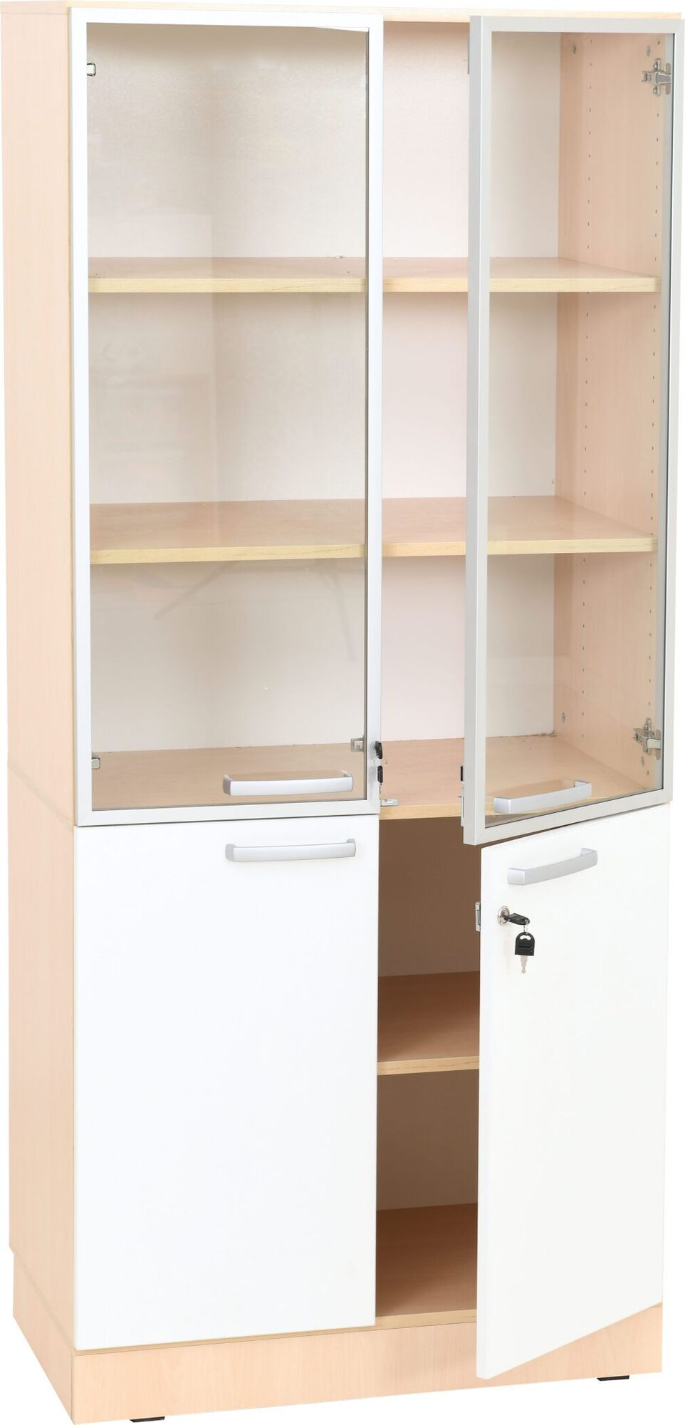 Een mooie hoge vitrinekast met dichte witte deuren onder, en glazen deuren boven.