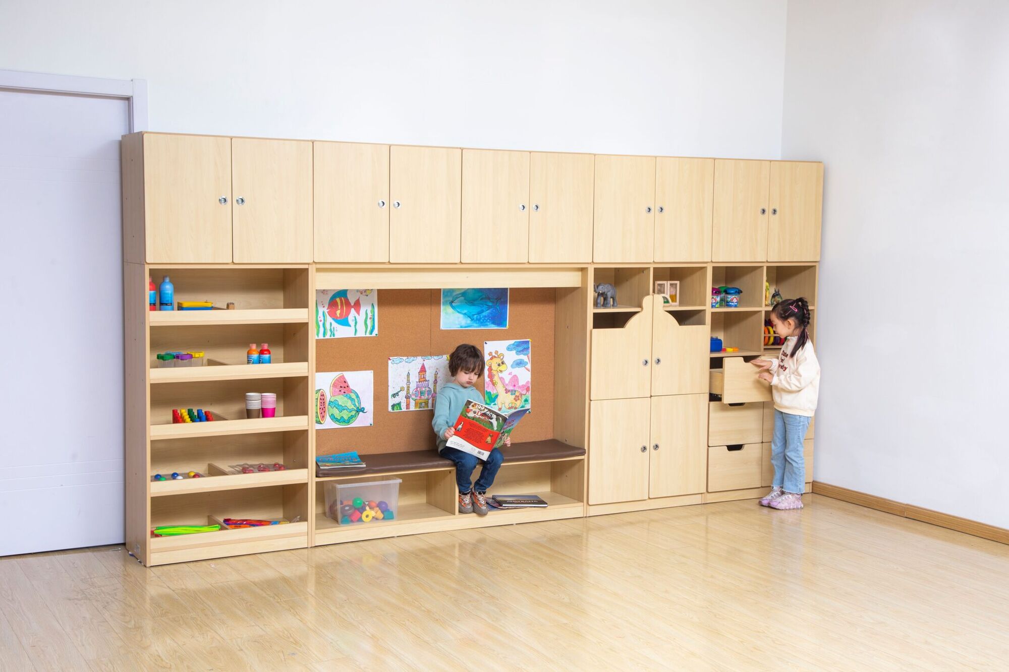 De stellingkast is voorzien van veel opbergruimte en goed georganiseerde compartimenten, waarvan sommige zijn voorzien van opstaande randen om te voorkomen dat opgeborgen materialen niet wegglijden. In het bovenste gedeelte van de wandenkast vind je bovenkasten met deuren, waardoor je spullen netjes kunt opbergen materialen.