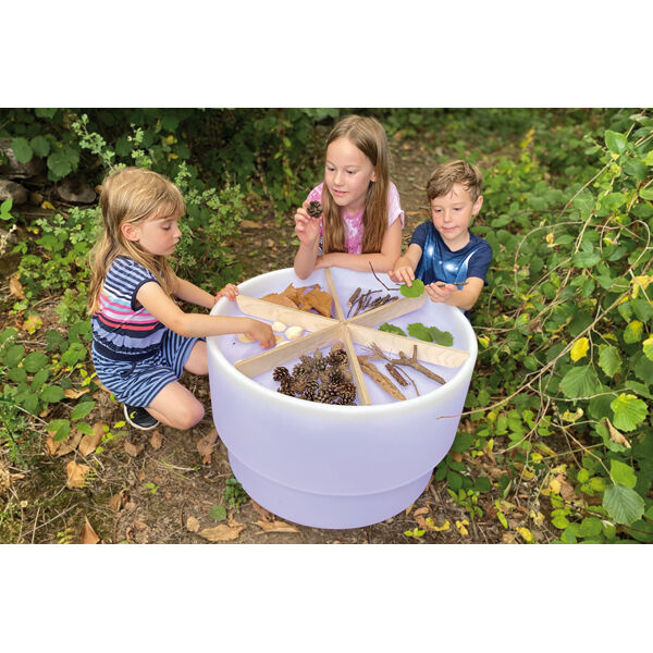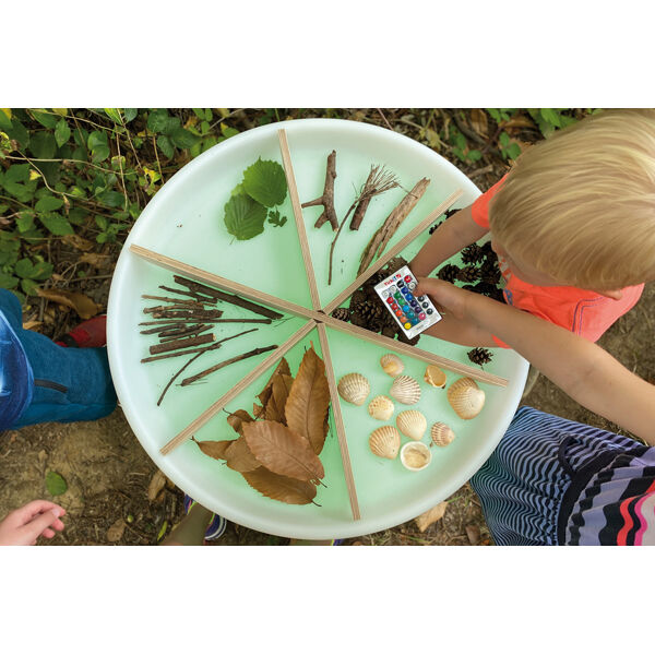 Op deze ronde lichttafel met opstaande rand kunnen kinderen zowel binnen als buiten vormen, texturen en kleuren van verschillende materialen en stoffen onderzoeken.