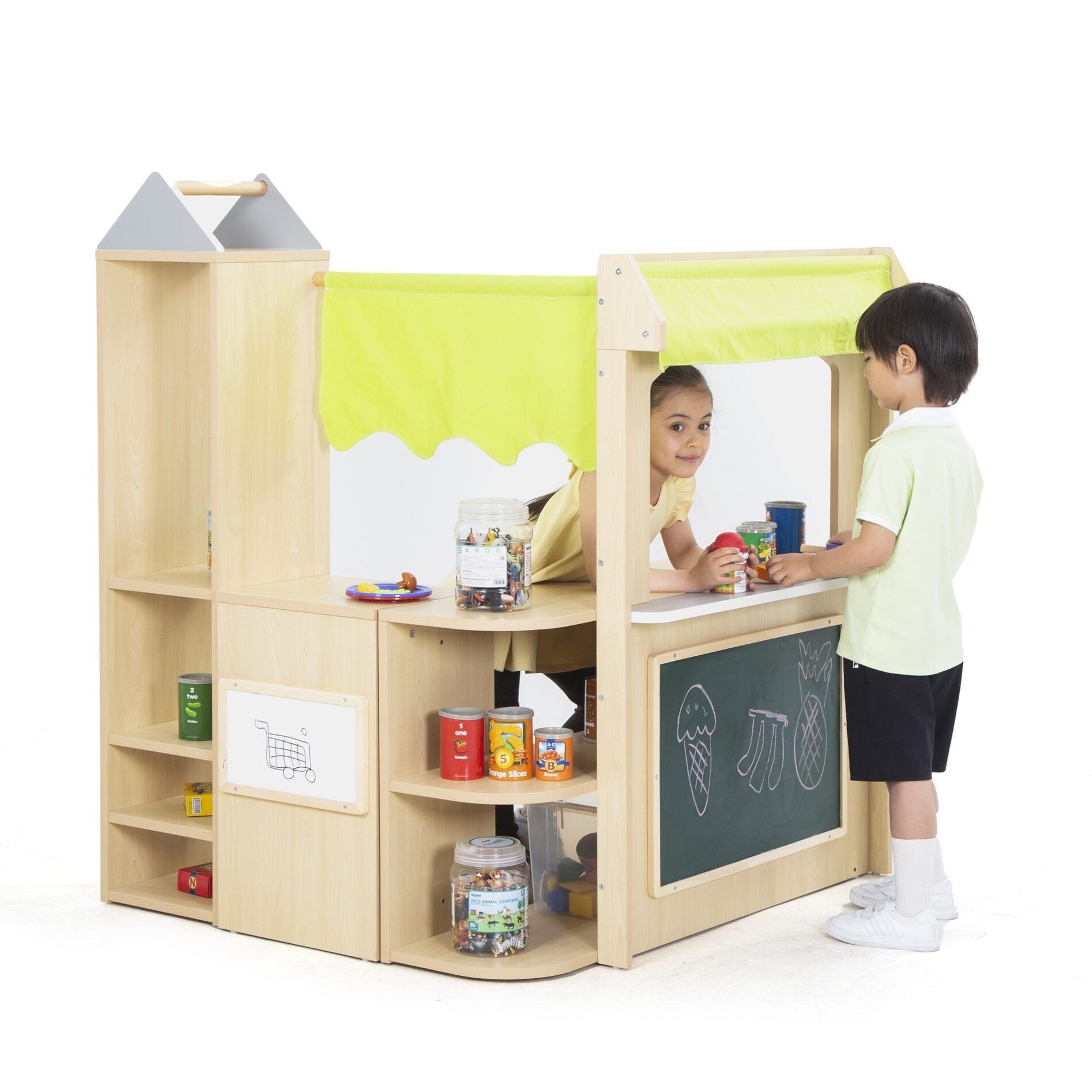 - Planken voor speelgoed en producten: De ingebouwde planken bieden voldoende ruimte om goederen, speelgoed en voedsel te presenteren.