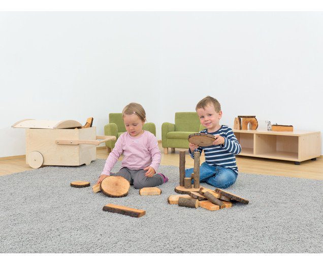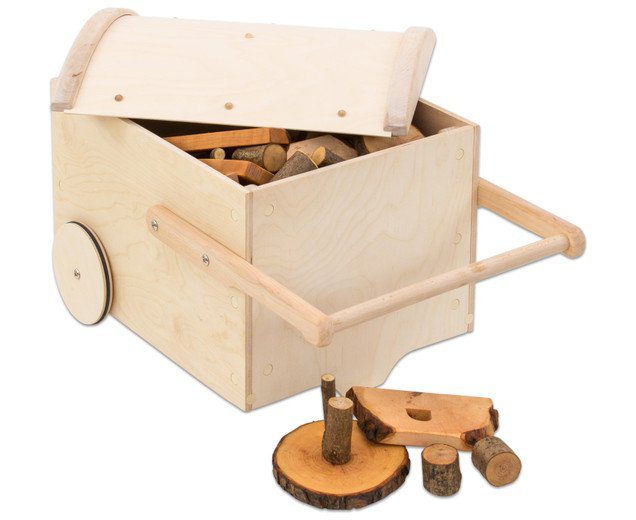 Beschrijving Woods boomblokken – houten blokken in verrijdbare kar