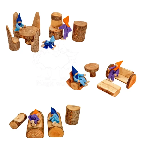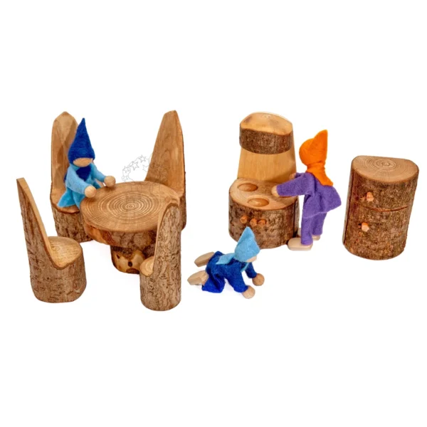 Alle boomhutten en poppenhuizen hebben meubeltjes nodig. Deze meubellijn biedt voldoende voorzieningen om mee te spelen. Je kunt alle Small world interieurs decoreren en de speelwaarde van ander speelgoed verhogen. Het rustieke uiterlijk past goed bij ander speelgoed in Waldorf-stijl.